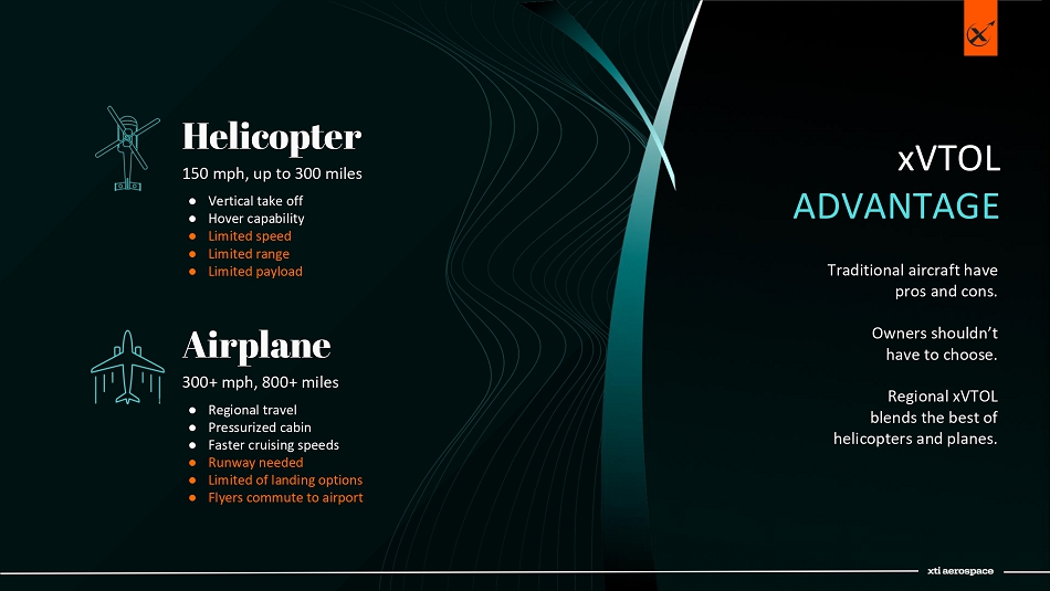 Airplane 300+ mph, 800+ miles ● Regional travel ● Pressurized cabin ● Faster cruising speeds ● Runway needed ● Limited of landing options ● Flyers commute to airport xVTOL ADVANTAGE Helicopter 150 mph, up to 300 miles ● Vertical take off ● Hover capability ● Limited speed ● Limited range ● Limited payload Traditional aircraft have pros and cons. Owners shouldn’t have to choose. Regional xVTOL blends the best of helicopters and planes.