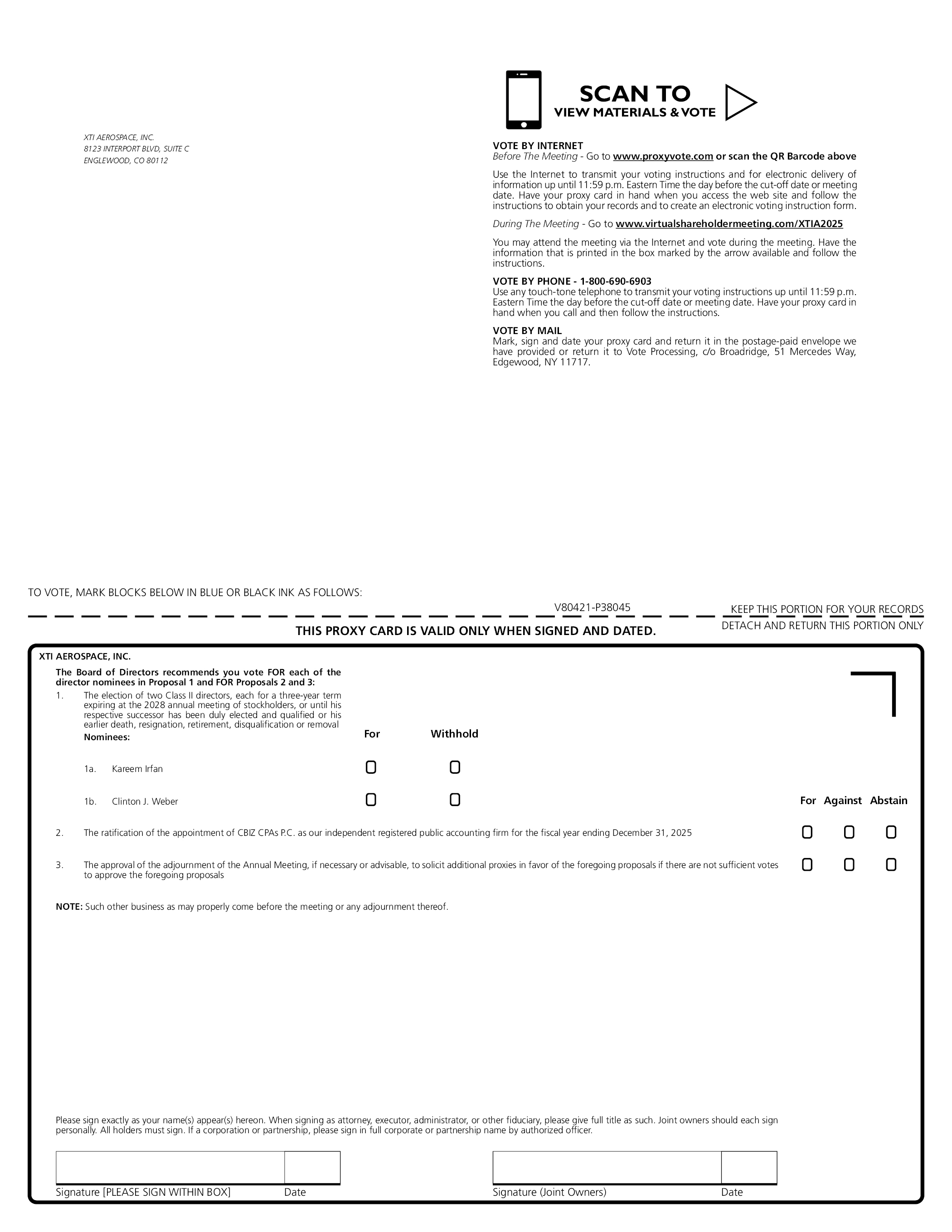 SCAN TO VIEW MATERIALS & VOTE XTI AEROSPACE, INC. 8123 INTERPORT BLVD, SUITE C ENGLEWOOD, CO 80112 VOTE BY INTERNET Before The Meeting - Go to www.proxyvote.com or scan the QR Barcode above Use the Internet to transmit your voting instructions and for electronic delivery of information up until 11:59 p.m. Eastern Time the day before the cut-off date or meeting date. Have your proxy card in hand when you access the web site and follow the instructions to obtain your records and to create an electronic voting instruction form. During The Meeting - Go to www.virtualshareholdermeeting.com/XTIA2025 You may attend the meeting via the Internet and vote during the meeting. Have the information that is printed in the box marked by the arrow available and follow the instructions. VOTE BY PHONE - 1-800-690-6903 Use any touch-tone telephone to transmit your voting instructions up until 11:59 p.m. Eastern Time the day before the cut-off date or meeting date. Have your proxy card in hand when you call and then follow the instructions. VOTE BY MAIL Mark, sign and date your proxy card and return it in the postage-paid envelope we have provided or return it to Vote Processing, c/o Broadridge, 51 Mercedes Way, Edgewood, NY 11717. TO VOTE, MARK BLOCKS BELOW IN BLUE OR BLACK INK AS FOLLOWS: V80421-P38045 KEEP THIS PORTION FOR YOUR RECORDS THIS PROXY CARD IS VALID ONLY WHEN SIGNED AND DATED. DETACH AND RETURN THIS PORTION ONLY XTI AEROSPACE, INC. The Board of Directors recommends you vote FOR each of the director nominees in Proposal 1 and FOR Proposals 2 and 3: 1. The election of two Class II directors, each for a three-year term expiring at the 2028 annual meeting of stockholders, or until his respective successor has been duly elected and qualified or his earlier death, resignation, retirement, disqualification or removal Nominees: 1a. Kareem Irfan 1b. Clinton J. Weber For Withhold 2. The ratification of the appointment of CBIZ CPAs P.C. as our independent registered public accounting firm for the fiscal year ending December 31, 2025 3. The approval of the adjournment of the Annual Meeting, if necessary or advisable, to solicit additional proxies in favor of the foregoing proposals if there are not sufficient votes to approve the foregoing proposals NOTE: Such other business as may properly come before the meeting or any adjournment thereof. For Against Abstain Please sign exactly as your name(s) appear(s) hereon. When signing as attorney, executor, administrator, or other fiduciary, please give full title as such. Joint owners should each sign personally. All holders must sign. If a corporation or partnership, please sign in full corporate or partnership name by authorized officer. Signature [PLEASE SIGN WITHIN BOX] Date Signature (Joint Owners) Signature (Joint Owners)