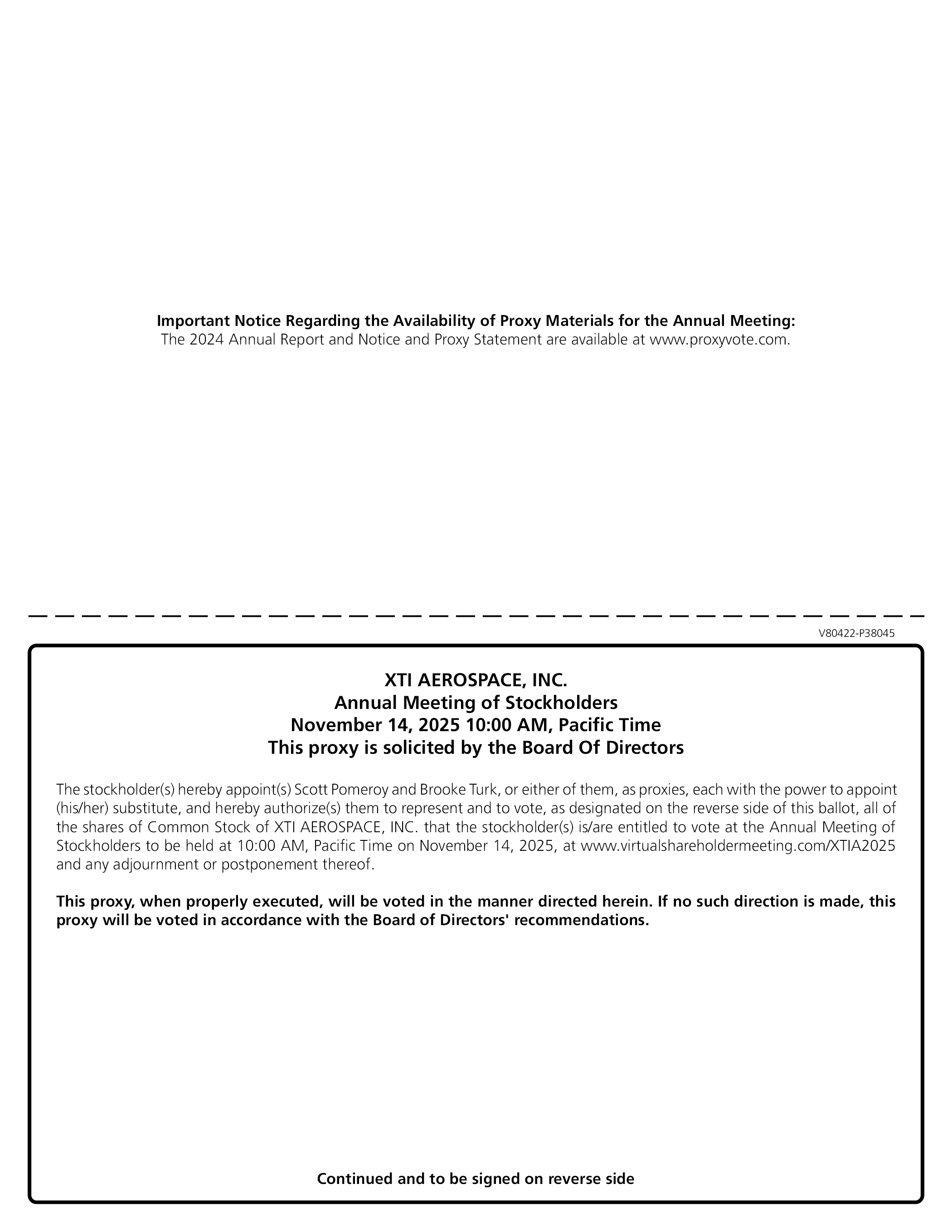 Important Notice Regarding the Availability of Proxy Materials for the Annual Meeting: The 2024 Annual Report and Notice and Proxy Statement are available at www.proxyvote.com. V80422-P38045 XTI AEROSPACE, INC. Annual Meeting of Stockholders November 14, 2025 10:00 AM, Pacific Time This proxy is solicited by the Board Of Directors The stockholder(s) hereby appoint(s) Scott Pomeroy and Brooke Turk, or either of them, as proxies, each with the power to appoint (his/her) substitute, and hereby authorize(s) them to represent and to vote, as designated on the reverse side of this ballot, all of the shares of Common Stock of XTI AEROSPACE, INC. that the stockholder(s) is/are entitled to vote at the Annual Meeting of Stockholders to be held at 10:00 AM, Pacific Time on November 14, 2025, at www.virtualshareholdermeeting.com/XTIA2025 and any adjournment or postponement thereof. This proxy, when properly executed, will be voted in the manner directed herein. If no such direction is made, this proxy will be voted in accordance with the Board of Directors’ recommendations. Continued and to be signed on reverse side