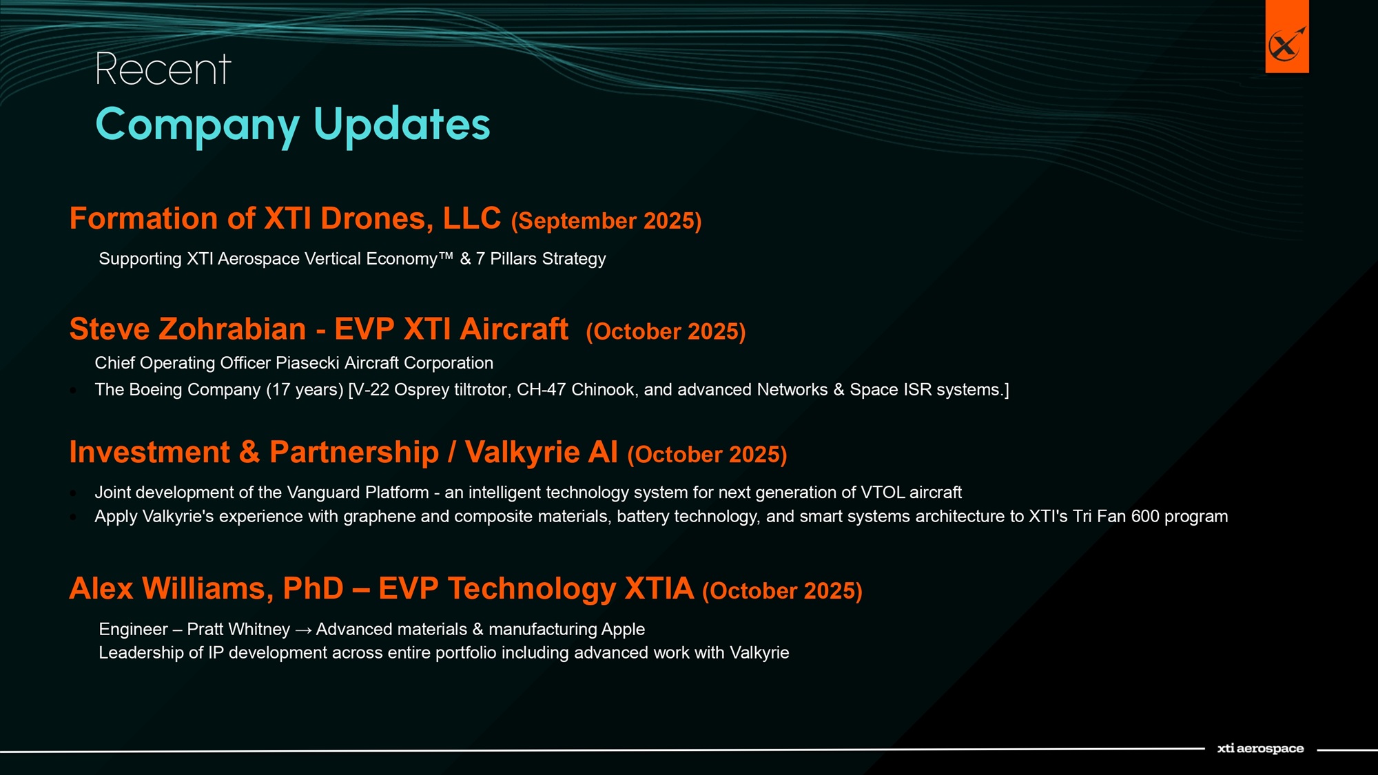 Formation of XTI Drones, LLC ( September 20 25) Supporting XTI Aerospace Vertical Economy & 7 Pillars Strategy Steve Zohrabian - EVP XTI Aircraft ( October 2025 ) Chief Operating Officer Piasecki Aircraft Corporation The Boeing Company (17 years) [V - 22 Osprey tiltrotor, CH - 47 Chinook, and advanced Networks & Space ISR systems.] Investment & Partnership / Valkyrie AI ( October 2025 ) J oint development of the Vanguard Platform - an intelligent technology system for next generation of VTOL aircraft A pply Valkyrie's experience with graphene and composite materials, battery technology, and smart systems architecture to XTI's Tr i Fan 600 program Alex Williams, PhD – EVP Technology XTIA (October 2025) Engineer – Pratt Whitney → Advanced materials & manufacturing Apple Leadership of IP development across entire portfolio including advanced work with Valkyrie Recent Company Updates