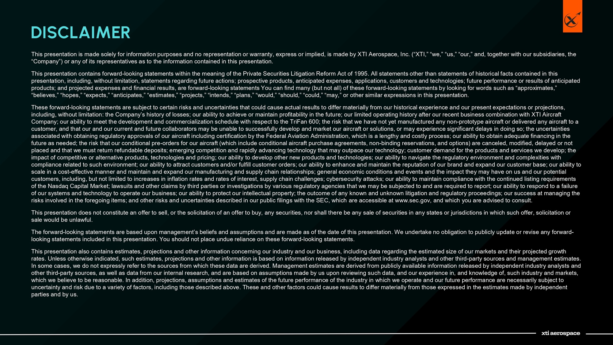 DISCLAIMER This presentation is made solely for information purposes and no representation or warranty, express or implied, is made by XTI Aerospace, Inc. (“XTI,” “we,” “us,” “our,” and, together with our subsidiaries, the “Company”) or any of its representatives as to the information contained in this presentation. This presentation contains forward - looking statements within the meaning of the Private Securities Litigation Reform Act of 1995. All statements other than statements of historical facts contained in this presentation, including, without limitation, statements regarding future actions; prospective products, anticipated expenses, applications, customers and technologies; future performance or results of anticipated products; and projected expenses and financial results, are forward - looking statements You can find many (but not all) of these forward - looking statements by looking for words such as “approximates,” “believes,” “hopes,” “expects,” “anticipates,” “estimates,” “projects,” “intends,” “plans,” “would,” “should,” “could,” “may,” or other similar expressions in this presentation. These forward - looking statements are subject to certain risks and uncertainties that could cause actual results to differ materially from our historical experience and our present expectations or projections, including, without limitation: the Company’s history of losses; our ability to achieve or maintain profitability in the future; our limited operating history after our recent business combination with XTI Aircraft Company; our ability to meet the development and commercialization schedule with respect to the TriFan 600; the risk that we have not yet manufactured any non - prototype aircraft or delivered any aircraft to a customer, and that our and our current and future collaborators may be unable to successfully develop and market our aircraft or solutions, or may experience significant delays in doing so; the uncertainties associated with obtaining regulatory approvals of our aircraft including certification by the Federal Aviation Administration, which is a lengthy and costly process; our ability to obtain adequate financing in the future as needed; the risk that our conditional pre - orders for our aircraft (which include conditional aircraft purchase agreements, non - binding reservations, and options) are canceled, modified, delayed or not placed and that we must return refundable deposits; emerging competition and rapidly advancing technology that may outpace our technology; customer demand for the products and services we develop; the impact of competitive or alternative products, technologies and pricing; our ability to develop other new products and technologies; our ability to navigate the regulatory environment and complexities with compliance related to such environment; our ability to attract customers and/or fulfill customer orders; our ability to enhance and maintain the reputation of our brand and expand our customer base; our ability to scale in a cost - effective manner and maintain and expand our manufacturing and supply chain relationships; general economic conditions and events and the impact they may have on us and our potential customers, including, but not limited to increases in inflation rates and rates of interest, supply chain challenges; cybersecurity attacks; our ability to maintain compliance with the continued listing requirements of the Nasdaq Capital Market; lawsuits and other claims by third parties or investigations by various regulatory agencies that we may be subjected to and are required to report; our ability to respond to a failure of our systems and technology to operate our business; our ability to protect our intellectual property; the outcome of any known and unknown litigation and regulatory proceedings; our success at managing the risks involved in the foregoing items; and other risks and uncertainties described in our public filings with the SEC, which are accessible at www.sec.gov, and which you are advised to consult. This presentation does not constitute an offer to sell, or the solicitation of an offer to buy, any securities, nor shall there be any sale of securities in any states or jurisdictions in which such offer, solicitation or sale would be unlawful. The forward - looking statements are based upon management’s beliefs and assumptions and are made as of the date of this presentation. We undertake no obligation to publicly update or revise any forward - looking statements included in this presentation. You should not place undue reliance on these forward - looking statements. This presentation also contains estimates, projections and other information concerning our industry and our business, including data regarding the estimated size of our markets and their projected growth rates. Unless otherwise indicated, such estimates, projections and other information is based on information released by independent industry analysts and other third - party sources and management estimates. In some cases, we do not expressly refer to the sources from which these data are derived. Management estimates are derived from publicly available information released by independent industry analysts and other third - party sources, as well as data from our internal research, and are based on assumptions made by us upon reviewing such data, and our experience in, and knowledge of, such industry and markets, which we believe to be reasonable. In addition, projections, assumptions and estimates of the future performance of the industry in which we operate and our future performance are necessarily subject to uncertainty and risk due to a variety of factors, including those described above. These and other factors could cause results to differ materially from those expressed in the estimates made by independent parties and by us.
