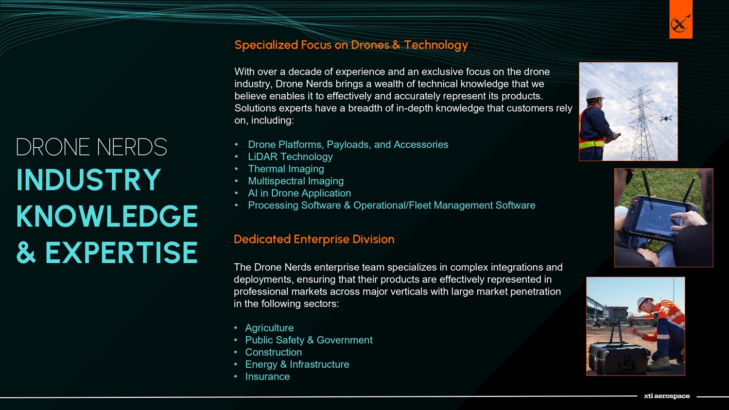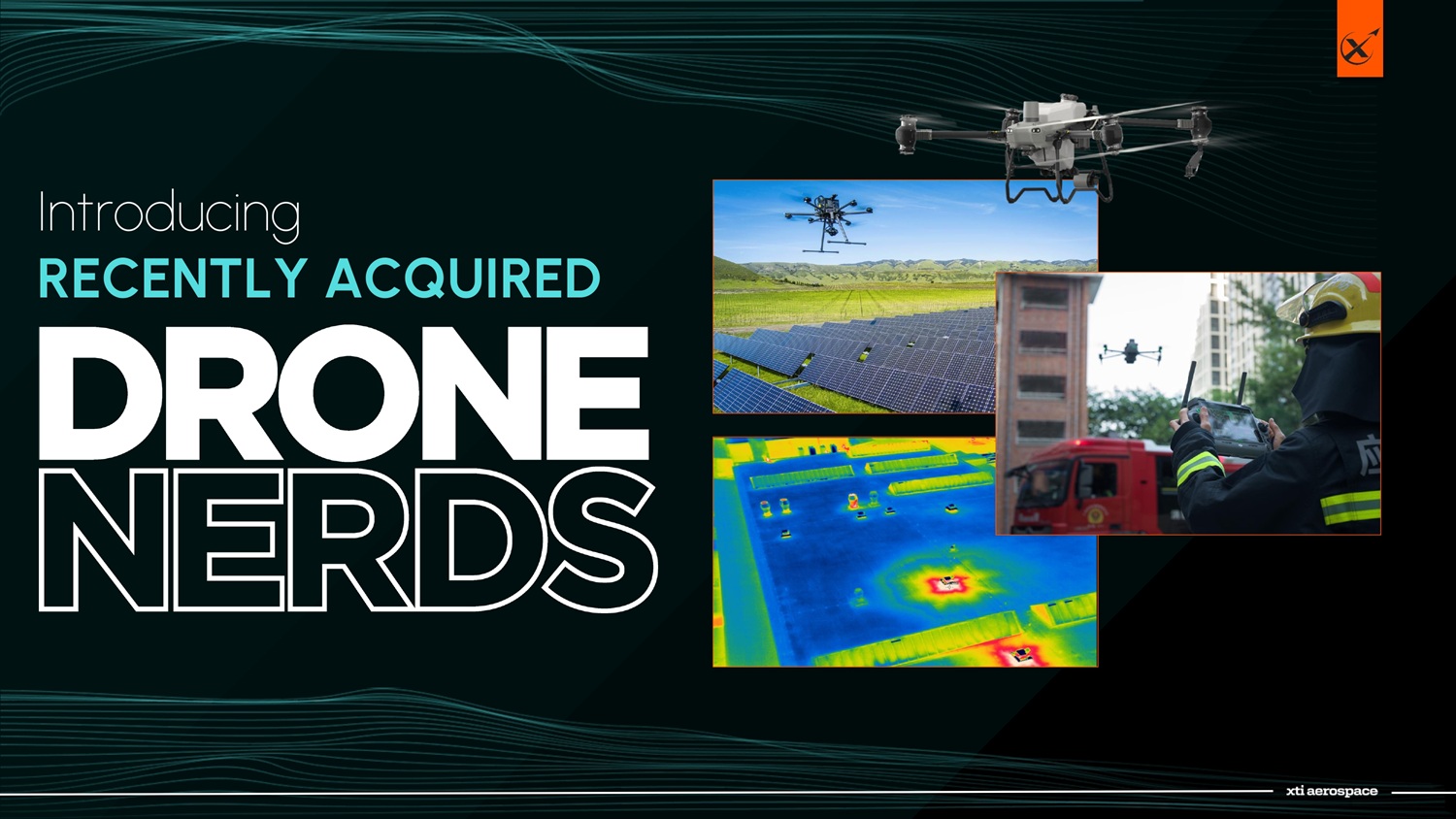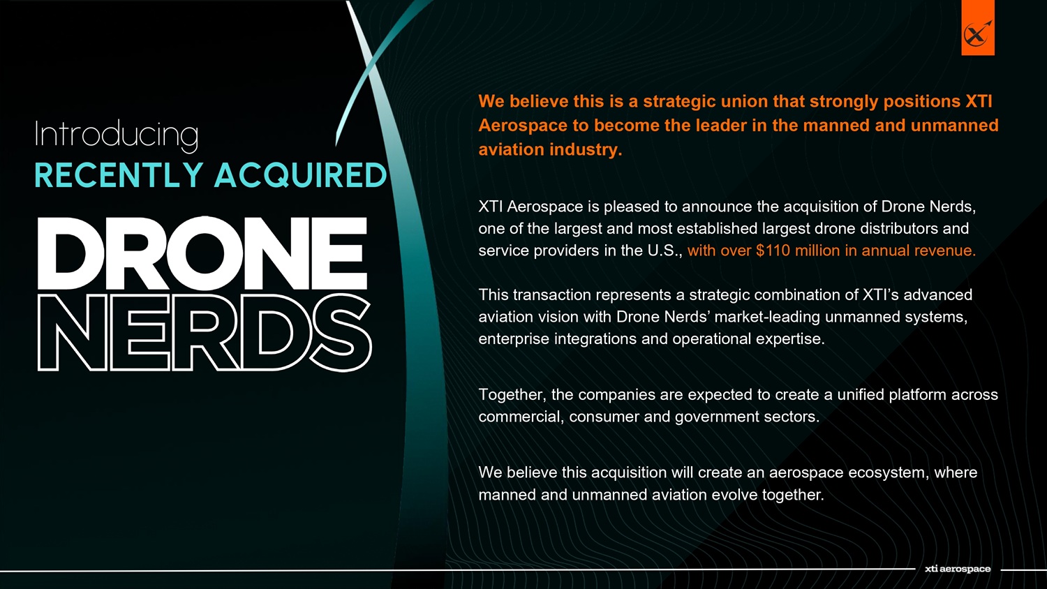 We believe this is a strategic union that strongly positions XTI Aerospace to become the leader in the manned and unmanned aviation industry. XTI Aerospace is pleased to announce the acquisition of Drone Nerds, one of the largest and most established largest drone distributors and service providers in the U.S., with over $110 million in annual revenue. This transaction represents a strategic combination of XTI’s advanced aviation vision with Drone Nerds’ market - leading unmanned systems, enterprise integrations and operational expertise . Together, the companies are expected to create a unified platform across commercial, consumer and government sectors . We believe this acquisition will create an aerospace ecosystem, where manned and unmanned aviation evolve together . Introducing RECENTLY ACQUIRED