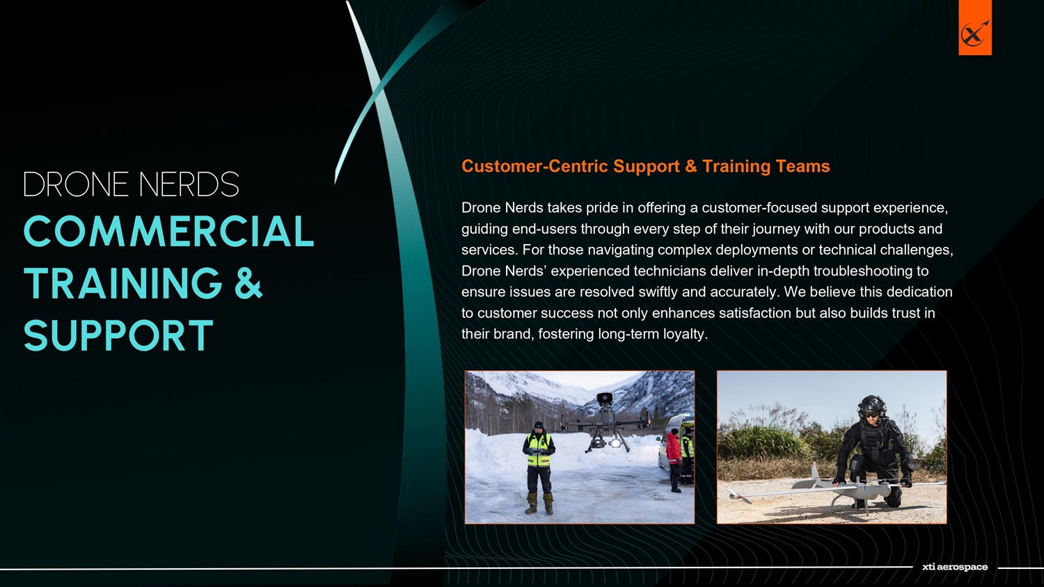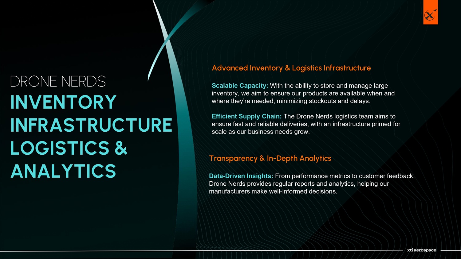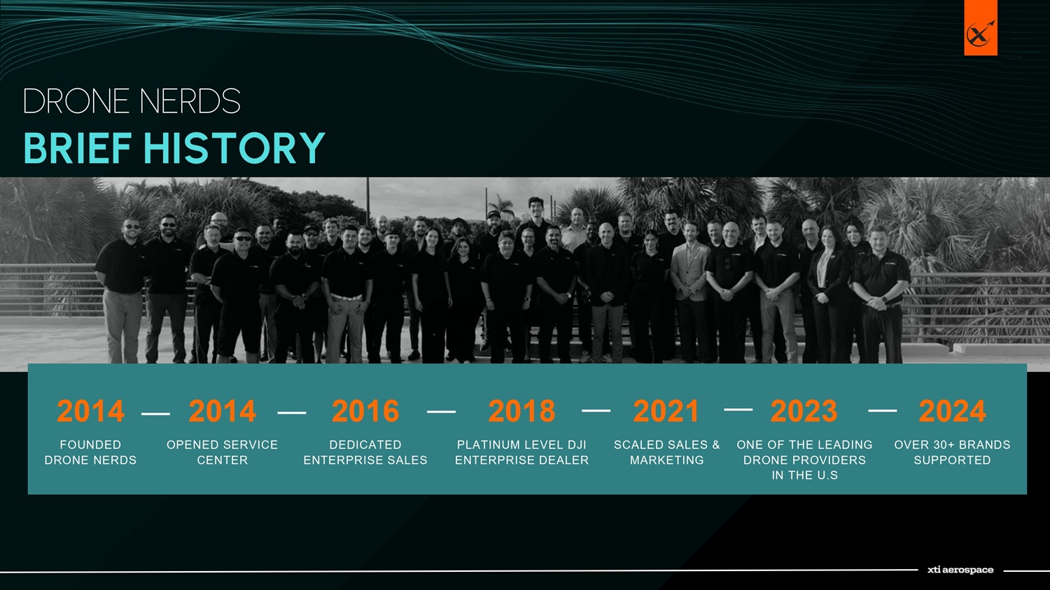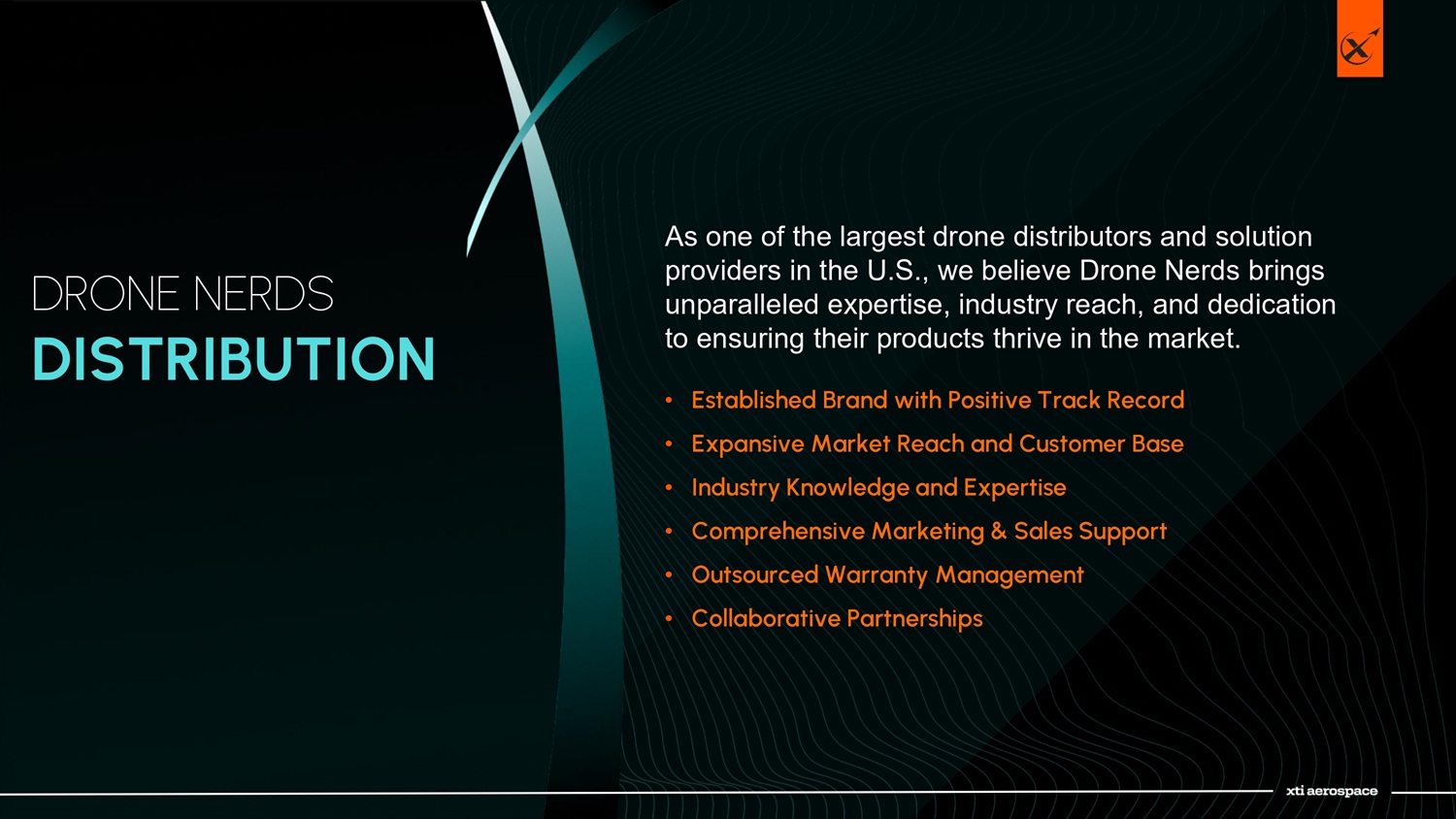 We believe this is a strategic union that strongly positions XTI Aerospace to become the leader in the manned and unmanned aviation industry. XTI Aerospace is pleased to announce the acquisition of Drone Nerds, one of the largest and most established largest drone distributors and service providers in the U.S., with over $110 million in annual revenue. This transaction represents a strategic combination of XTI’s advanced aviation vision with Drone Nerds’ market - leading unmanned systems, enterprise integrations and operational expertise . Together, the companies are expected to create a unified platform across commercial, consumer and government sectors . We believe this acquisition will create an aerospace ecosystem, where manned and unmanned aviation evolve together . Introducing RECENTLY ACQUIRED