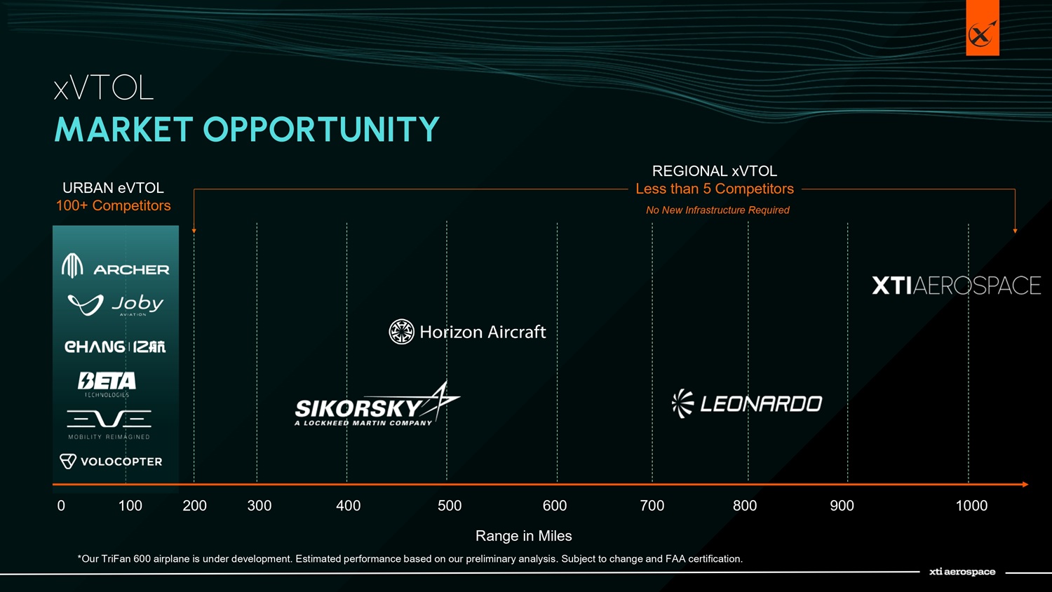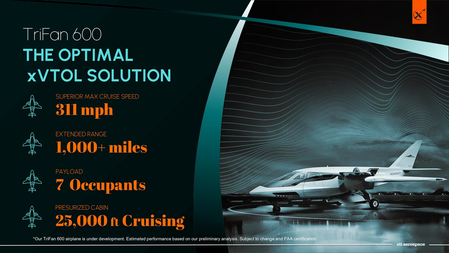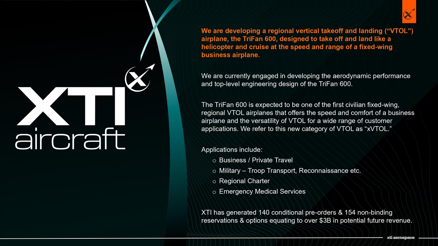 We are developing a regional vertical takeoff and landing (“VTOL”) airplane, the TriFan 600, designed to take off and land like a helicopter and cruise at the speed and range of a fixed - wing business airplane. We are currently engaged in developing the aerodynamic performance and top - level engineering design of the TriFan 600. The TriFan 600 is expected to be one of the first civilian fixed - wing, regional VTOL airplanes that offers the speed and comfort of a business airplane and the versatility of VTOL for a wide range of customer applications. We refer to this new category of VTOL as “xVTOL.” Applications include: o Business / Private Travel o Military – Troop Transport, Reconnaissance etc. o Regional Charter o Emergency Medical Services XTI has generated 140 conditional pre - orders & 154 non - binding reservations & options equating to over $3B in potential future revenue.