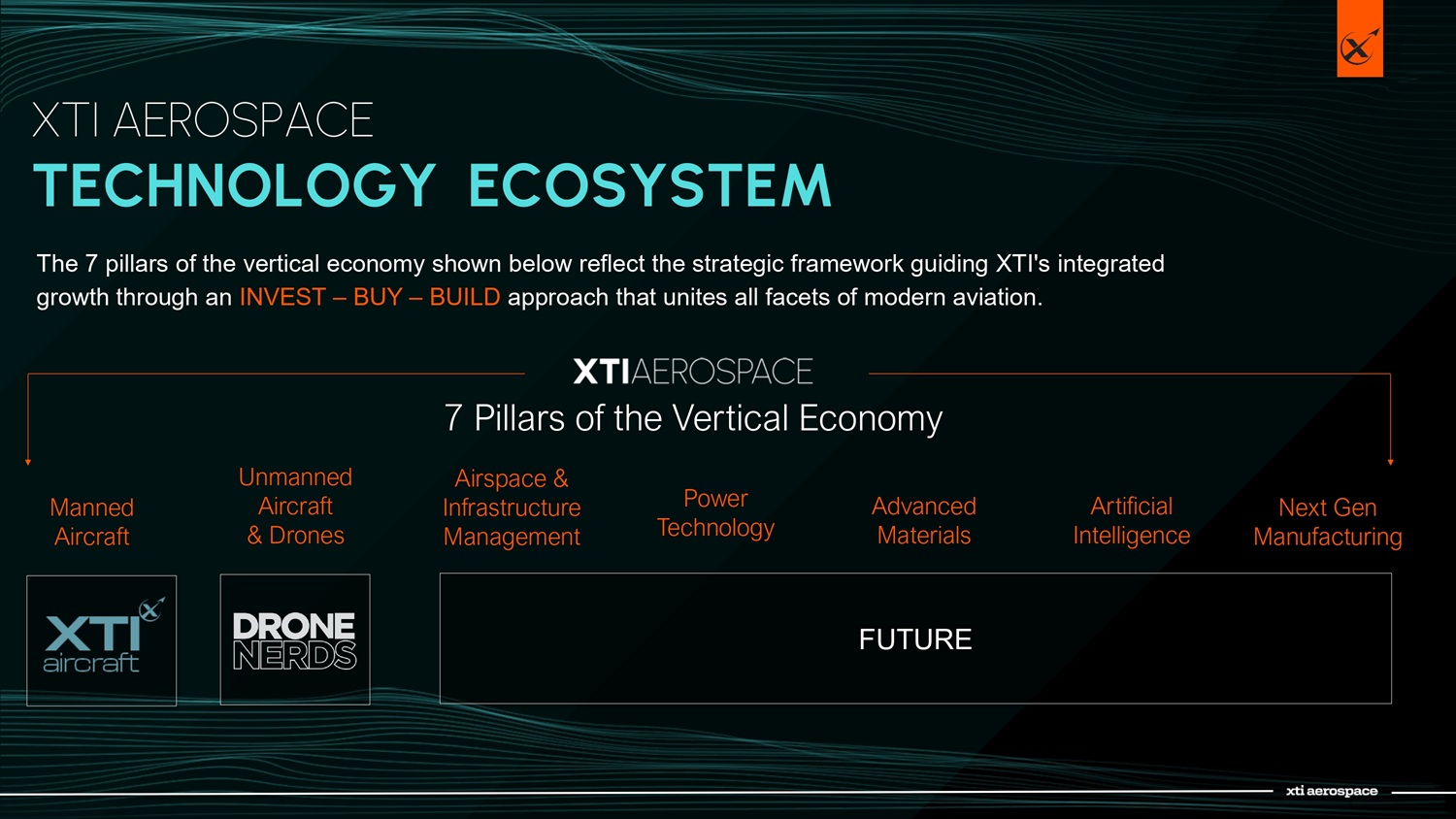 XTI AEROSPACE TECHNOLOGY ECOSYSTEM The 7 pillars of the vertical economy shown below reflect the strategic framework guiding XTI's integrated growth through an INVEST – BUY – BUILD approach that unites all facets of modern aviation. 7 Pillars of the Vertical Economy Unmanned Aircraft & Drones Manned Aircraft Power Technology Airspace & Infrastructure Management Artificial Intelligence Advanced Materials Next Gen Manufacturing FUTURE