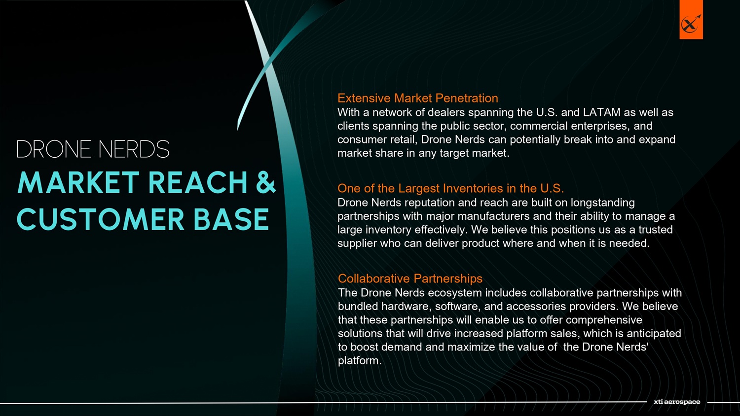 One of the Largest Inventories in the U.S. Drone Nerds reputation and reach are built on longstanding partnerships with major manufacturers and their ability to manage a large inventory effectively. We believe this positions us as a trusted supplier who can deliver product where and when it is needed. Extensive Market Penetration With a network of dealers spanning the U.S. and LATAM as well as clients spanning the public sector, commercial enterprises, and consumer retail, Drone Nerds can potentially break into and expand market share in any target market. Collaborative Partnerships The Drone Nerds ecosystem includes collaborative partnerships with bundled hardware, software, and accessories providers. We believe that these partnerships will enable us to offer comprehensive solutions that will drive increased platform sales, which is anticipated to boost demand and maximize the value of the Drone Nerds' platform. DRONE NERDS MARKET REACH & CUSTOMER BASE