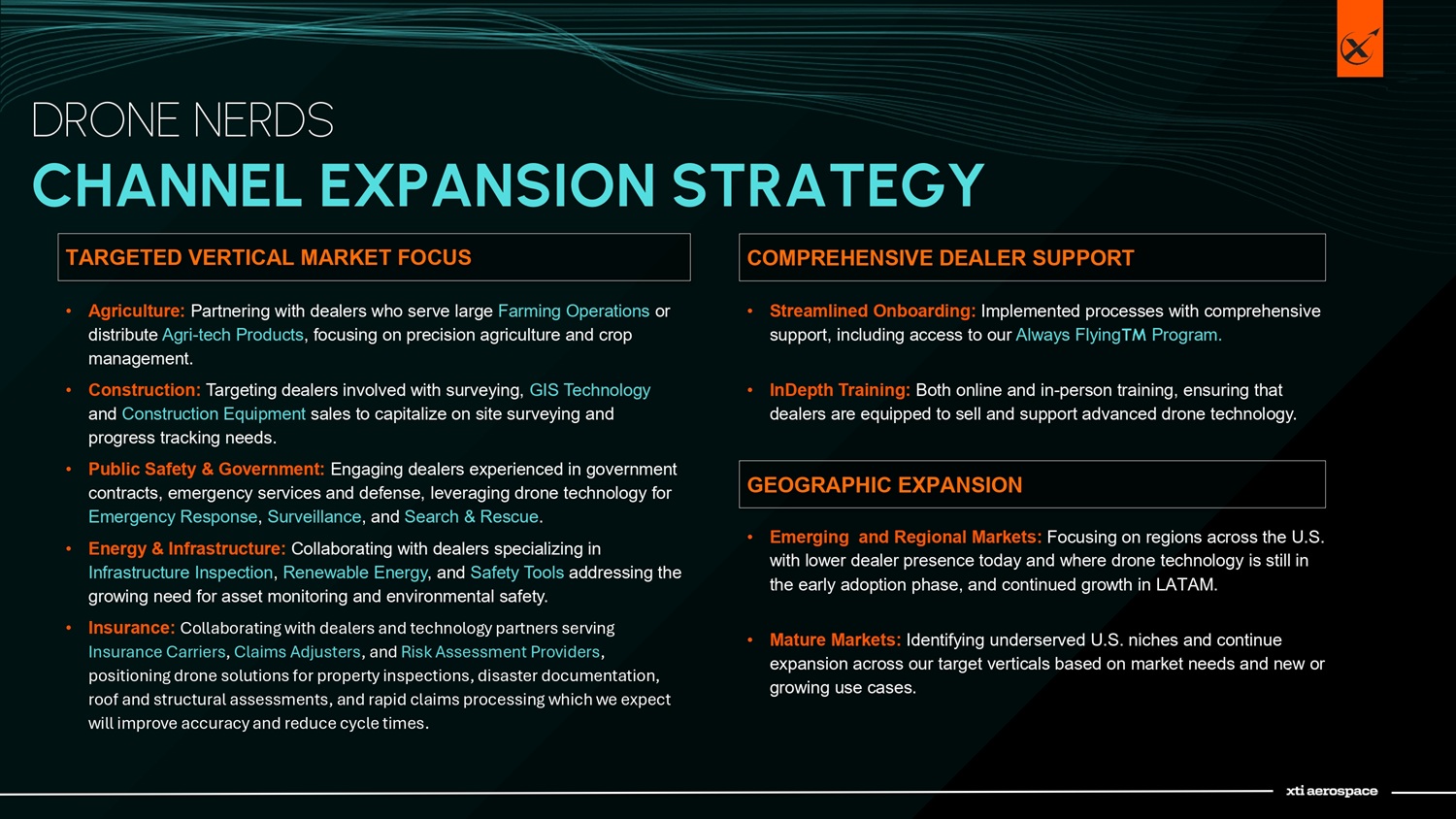 DRONE NERDS CHANNEL EXPANSION STRATEGY • Agriculture: Partnering with dealers who serve large Farming Operations or distribute Agri - tech Products , focusing on precision agriculture and crop management. • Construction: Targeting dealers involved with surveying, GIS Technology and Construction Equipment sales to capitalize on site surveying and progress tracking needs. • Public Safety & Government: Engaging dealers experienced in government contracts, emergency services and defense, leveraging drone technology for Emergency Response , Surveillance , and Search & Rescue . • Energy & Infrastructure: Collaborating with dealers specializing in Infrastructure Inspection , Renewable Energy , and Safety Tools addressing the growing need for asset monitoring and environmental safety. • Insurance: Collaborating with dealers and technology partners serving Insurance Carriers , Claims Adjusters , and Risk Assessment Providers , positioning drone solutions for property inspections, disaster documentation, roof and structural assessments, and rapid claims processing which we expect will improve accuracy and reduce cycle times. TARGETED VERTICAL MARKET FOCUS COMPREHENSIVE DEALER SUPPORT GEOGRAPHIC EXPANSION • Streamlined Onboarding: Implemented processes with comprehensive support, including access to our Always Flying Program. • InDepth Training: Both online and in - person training, ensuring that dealers are equipped to sell and support advanced drone technology. • Emerging and Regional Markets: Focusing on regions across the U.S. with lower dealer presence today and where drone technology is still in the early adoption phase, and continued growth in LATAM. • Mature Markets: Identifying underserved U.S. niches and continue expansion across our target verticals based on market needs and new or growing use cases.