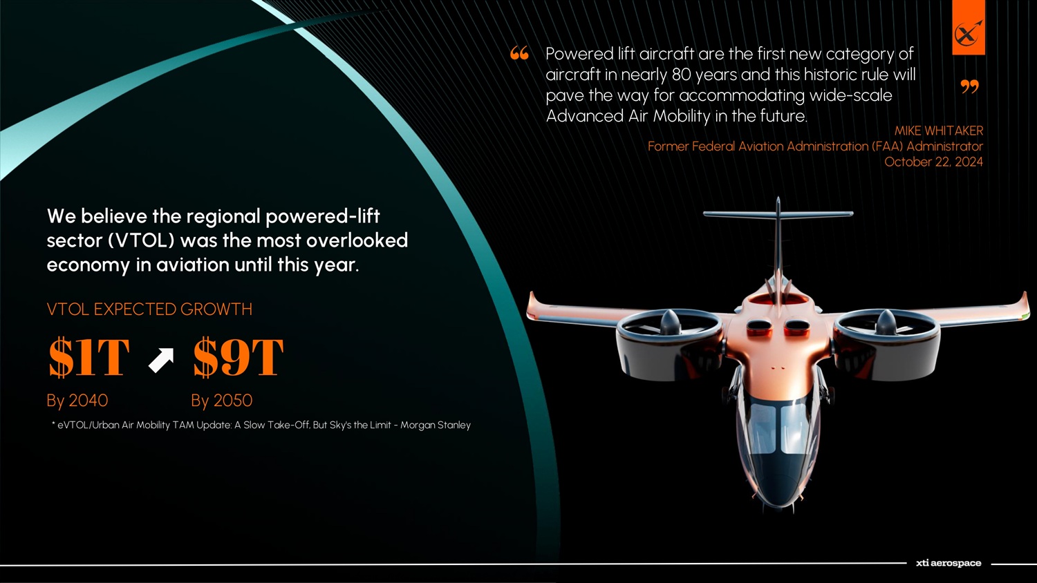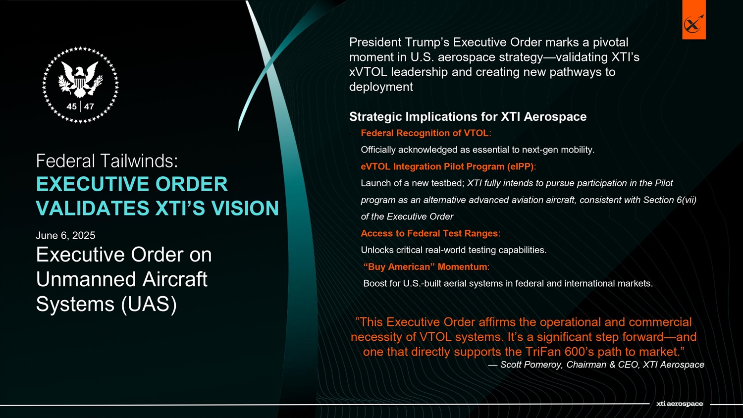Federal Tailwinds: EXECUTIVE ORDER VALIDATES XTI’S VISION June 6, 2025 Executive Order on Unmanned Aircraft Systems (UAS) ▪ Federal Recognition of VTOL : Officially acknowledged as essential to next - gen mobility. ▪ eVTOL Integration Pilot Program (eIPP) : Launch of a new testbed; XTI fully intends to pursue participation in the Pilot program as an alternative advanced aviation aircraft, consistent with Section 6(vii) of the Executive Order ▪ Access to Federal Test Ranges : Unlocks critical real - world testing capabilities. ▪ “Buy American” Momentum : Boost for U.S. - built aerial systems in federal and international markets. President Trump’s Executive Order marks a pivotal moment in U.S. aerospace strategy — validating XTI’s xVTOL leadership and creating new pathways to deployment Strategic Implications for XTI Aerospace ”This Executive Order affirms the operational and commercial necessity of VTOL systems. It’s a significant step forward — and one that directly supports the TriFan 600’s path to market.” — Scott Pomeroy, Chairman & CEO, XTI Aerospace
