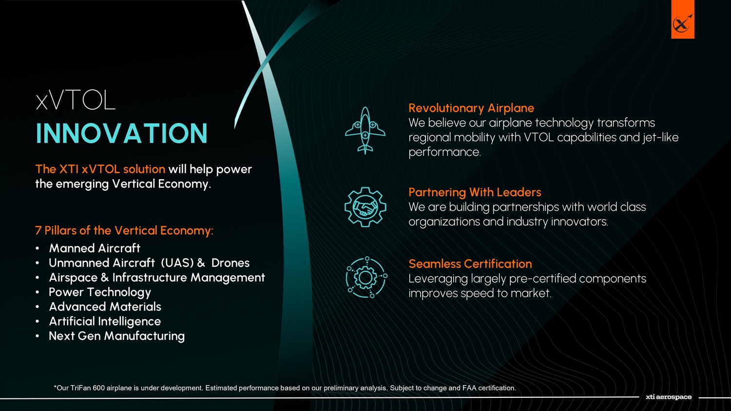 xVTOL INNOVATION The XTI xVTOL solution will help power the emerging Vertical Economy. 7 Pillars of the Vertical Economy: • Manned Aircraft • Unmanned Aircraft (UAS) & Drones • Airspace & Infrastructure Management • Power Technology • Advanced Materials • Artificial Intelligence • Next Gen Manufacturing Partnering With Leaders We are building partnerships with world class organizations and industry innovators. Revolutionary Airplane We believe our airplane technology transforms regional mobility with VTOL capabilities and jet - like performance. Seamless Certification Leveraging largely pre - certified components improves speed to market. *Our TriFan 600 airplane is under development. Estimated performance based on our preliminary analysis. Subject to change and FAA certification.