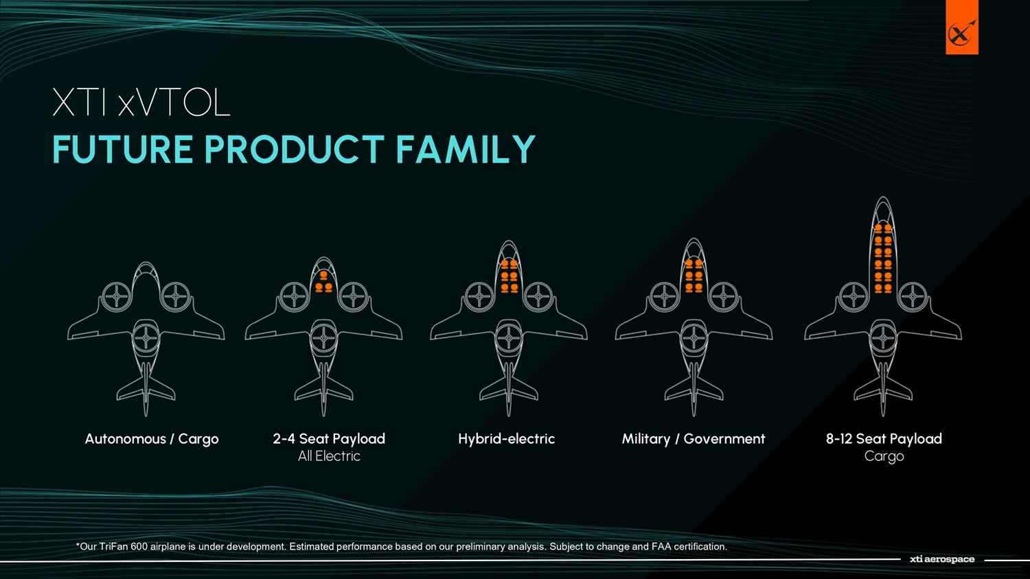 XTI xVTOL FUTURE PRODUCT FAMILY Autonomous / Cargo 2 - 4 Seat Payload All Electric Hybrid - electric Military / Government 8 - 12 Seat Payload Cargo *Our TriFan 600 airplane is under development. Estimated performance based on our preliminary analysis. Subject to change and FAA certification.