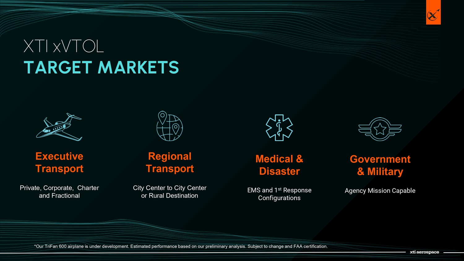 XTI xVTOL TARGET MARKETS Executive Transport Private, Corporate, Charter and Fractional *Our TriFan 600 airplane is under development. Estimated performance based on our preliminary analysis. Subject to change and FAA certification. Regional Transport City Center to City Center or Rural Destination Medical & Disaster EMS and 1 st Response Configurations Government & Military Agency Mission Capable