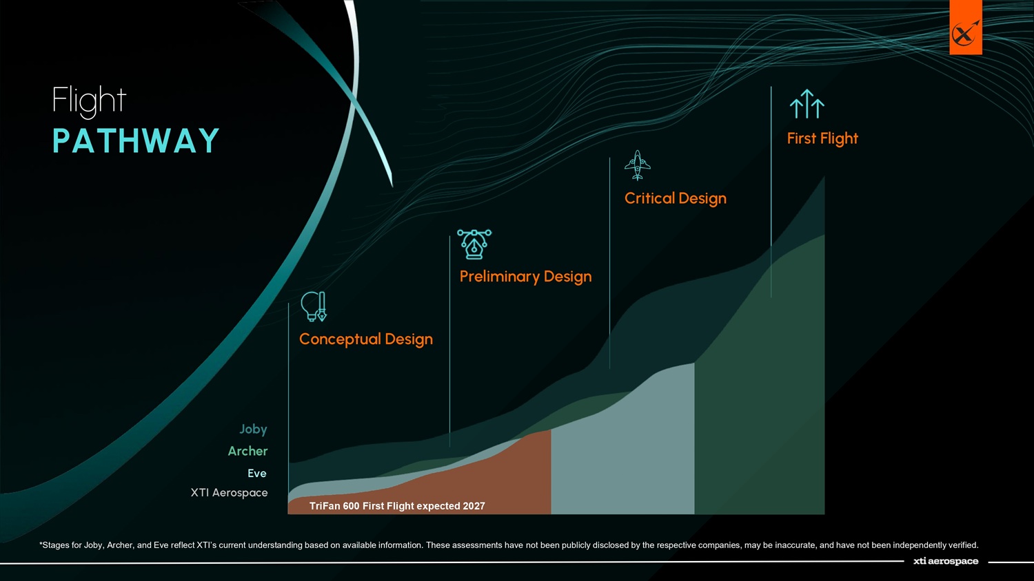 Flight PATHWAY Preliminary Design Conceptual Design Critical Design First Flight *Stages for Joby, Archer, and Eve reflect XTI’s current understanding based on available information. These assessments have not been publicly disclosed by the respective companies, may be inaccurate, and have not been independently verified. Joby Archer Eve XTI Aerospace TriFan 600 First Flight expected 2027