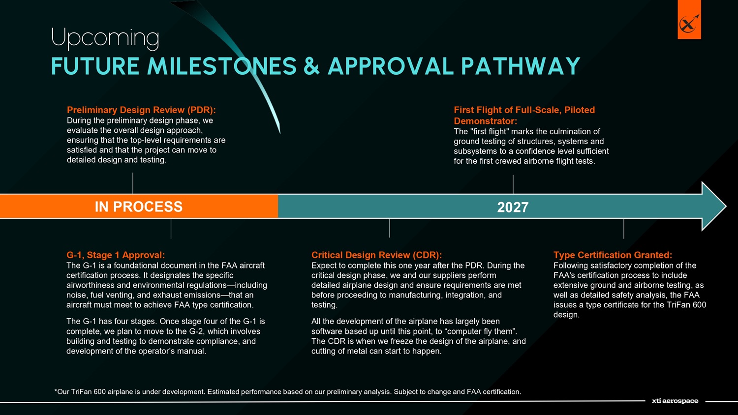Preliminary Design Review (PDR): During the preliminary design phase, we evaluate the overall design approach, ensuring that the top - level requirements are satisfied and that the project can move to detailed design and testing. G - 1, Stage 1 Approval: The G - 1 is a foundational document in the FAA aircraft certification process. It designates the specific airworthiness and environmental regulations — including noise, fuel venting, and exhaust emissions — that an aircraft must meet to achieve FAA type certification. The G - 1 has four stages. Once stage four of the G - 1 is complete, we plan to move to the G - 2, which involves building and testing to demonstrate compliance, and development of the operator’s manual. IN PROCESS Critical Design Review (CDR): Expect to complete this one year after the PDR. During the critical design phase, we and our suppliers perform detailed airplane design and ensure requirements are met before proceeding to manufacturing, integration, and testing. All the development of the airplane has largely been software based up until this point, to “computer fly them”. The CDR is when we freeze the design of the airplane, and cutting of metal can start to happen. First Flight of Full - Scale, Piloted Demonstrator: The "first flight" marks the culmination of ground testing of structures, systems and subsystems to a confidence level sufficient for the first crewed airborne flight tests. Type Certification Granted: Following satisfactory completion of the FAA's certification process to include extensive ground and airborne testing, as well as detailed safety analysis, the FAA issues a type certificate for the TriFan 600 design. 2027 Upcoming FUTURE MILESTONES & APPROVAL PATHWAY *Our TriFan 600 airplane is under development. Estimated performance based on our preliminary analysis. Subject to change and FAA certification.