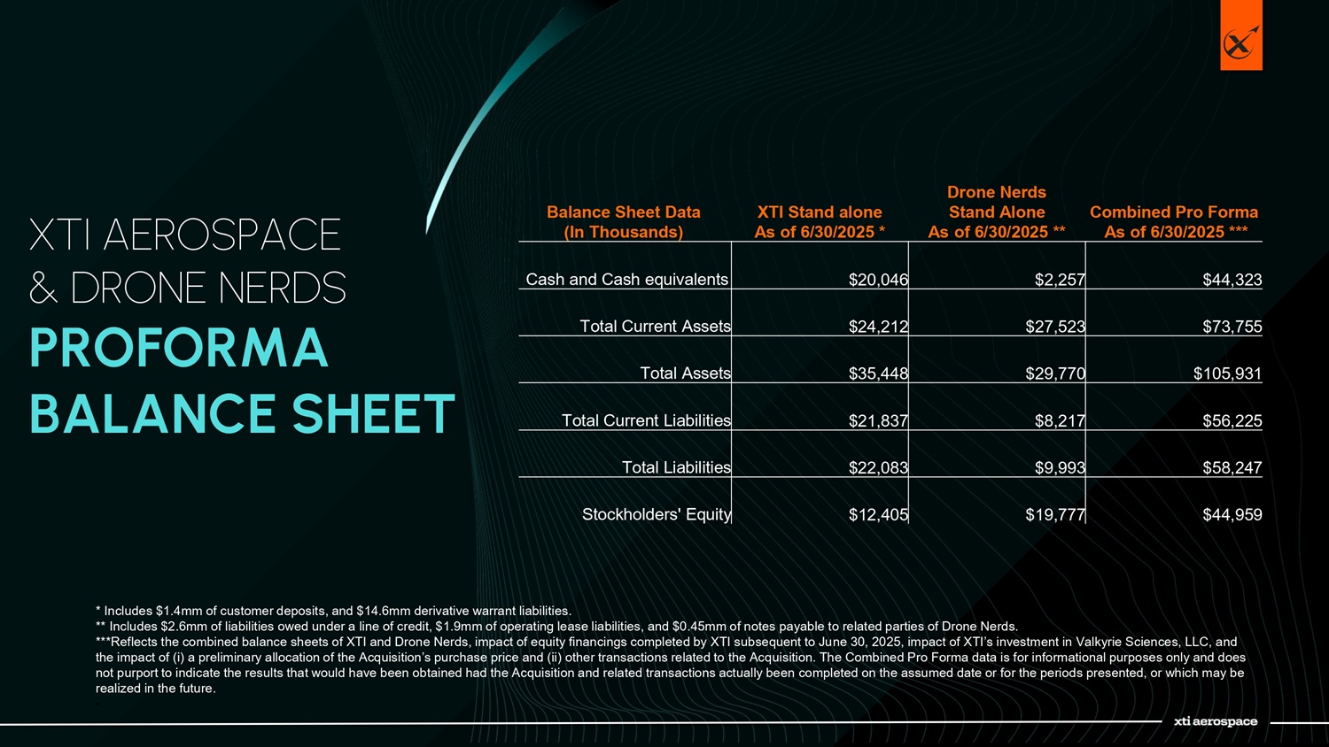 XTI AEROSPACE & DRONE NERDS PROFORMA BALANCE SHEET Combined Pro Forma As of 6/30/2025 *** Drone Nerds Stand Alone As of 6/30/2025 ** XTI Stand alone As of 6/30/2025 * Balance Sheet Data (In Thousands) $44,323 $2,257 $20,046 Cash and Cash equivalents $73,755 $27,523 $24,212 Total Current Assets $105,931 $29,770 $35,448 Total Assets $56,225 $8,217 $21,837 Total Current Liabilities $58,247 $9,993 $22,083 Total Liabilities $44,959 $19,777 $12,405 Stockholders' Equity * Includes $1.4mm of customer deposits, and $14.6mm derivative warrant liabilities. ** Includes $2.6mm of liabilities owed under a line of credit, $1.9mm of operating lease liabilities, and $0.45mm of notes payable to related parties of Drone Nerds. ***Reflects the combined balance sheets of XTI and Drone Nerds, impact of equity financings completed by XTI subsequent to June 30, 2025, impact of XTI’s investment in Valkyrie Sciences, LLC, and the impact of (i) a preliminary allocation of the Acquisition’s purchase price and (ii) other transactions related to the Acquisition. The Combined Pro Forma data is for informational purposes only and does not purport to indicate the results that would have been obtained had the Acquisition and related transactions actually been completed on the assumed date or for the periods presented, or which may be realized in the future. •
