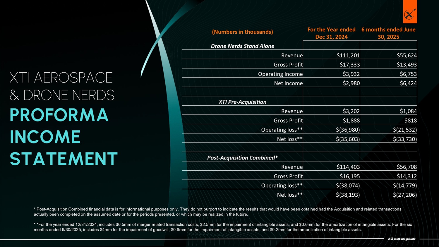 XTI AEROSPACE & DRONE NERDS PROFORMA INCOME STATEMENT * Post - Acquisition Combined financial data is for informational purposes only. They do not purport to indicate the results that would have been obtained had the Acquisition and related transactions actually been completed on the assumed date or for the periods presented, or which may be realized in the future. * *For the year ended 12/31/2024, includes $6.5mm of merger related transaction costs, $2.5mm for the impairment of intangible assets, and $0.6mm for the amortization of intangible assets. For the six months ended 6/30/2025, includes $4mm for the impairment of goodwill, $0.6mm for the impairment of intangible assets, and $0.2mm for the amortization of intangible assets. 6 months ended June 30, 2025 For the Year ended Dec 31, 2024 (Numbers in thousands) Drone Nerds Stand Alone $55,624 $111,201 Revenue $13,493 $17,333 Gross Profit $6,753 $3,932 Operating Income $6,424 $2,980 Net Income XTI Pre - Acquisition $1,084 $3,202 Revenue $818 $1,888 Gross Profit $(21,532) $(36,980) Operating loss** $(33,730) $(35,603) Net loss** Post - Acquisition Combined* $56,708 $114,403 Revenue $14,312 $16,195 Gross Profit $(14,779) $(38,074) Operating loss** $(27,206) $(38,193) Net loss**