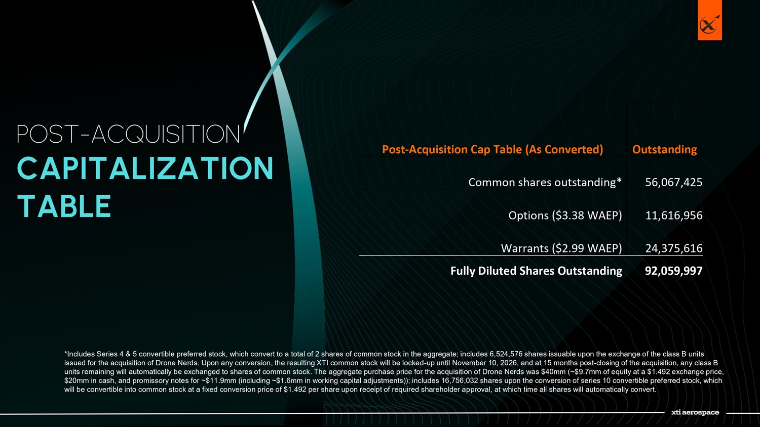 POST - ACQUISITION CAPITALIZATION TABLE Outstanding Post - Acquisition Cap Table (As Converted) 56,067,425 Common shares outstanding* 11,616,956 Options ($3.38 WAEP) 24,375,616 Warrants ($2.99 WAEP) 92,059,997 Fully Diluted Shares Outstanding • *Includes Series 4 & 5 convertible preferred stock, which convert to a total of 2 shares of common stock in the aggregate; includes 6,524,576 shares issuable upon the exchange of the class B units issued for the acquisition of Drone Nerds. Upon any conversion, the resulting XTI common stock will be locked - up until November 10, 2026, and at 15 months post - closing of the acquisition, any class B units remaining will automatically be exchanged to shares of common stock. The aggregate purchase price for the acquisition of Drone Nerds was $40mm (~$9.7mm of equity at a $1.492 exchange price, $20mm in cash, and promissory notes for ~$11.9mm (including ~$1.6mm in working capital adjustments)); includes 16,756,032 shares upon the conversion of series 10 convertible preferred stock, which will be convertible into common stock at a fixed conversion price of $1.492 per share upon receipt of required shareholder approval, at which time all shares will automatically convert.