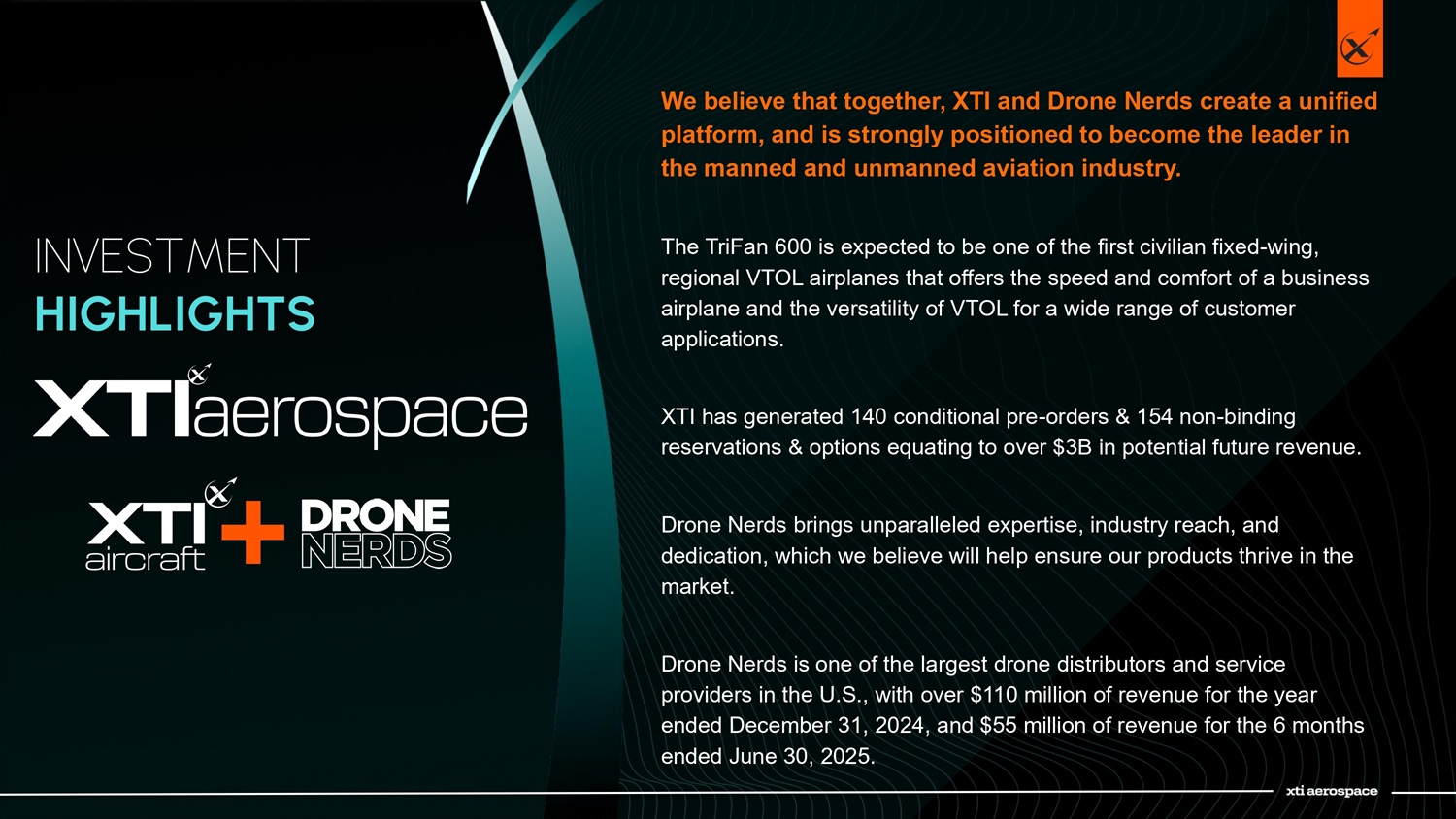 We believe that together, XTI and Drone Nerds create a unified platform, and is strongly positioned to become the leader in the manned and unmanned aviation industry. The TriFan 600 is expected to be one of the first civilian fixed - wing, regional VTOL airplanes that offers the speed and comfort of a business airplane and the versatility of VTOL for a wide range of customer applications. XTI has generated 140 conditional pre - orders & 154 non - binding reservations & options equating to over $3B in potential future revenue. Drone Nerds brings unparalleled expertise, industry reach, and dedication, which we believe will help ensure our products thrive in the market. Drone Nerds is one of the largest drone distributors and service providers in the U.S., with over $110 million of revenue for the year ended December 31, 2024, and $55 million of revenue for the 6 months ended June 30, 2025. INVESTMENT HIGHLIGHTS