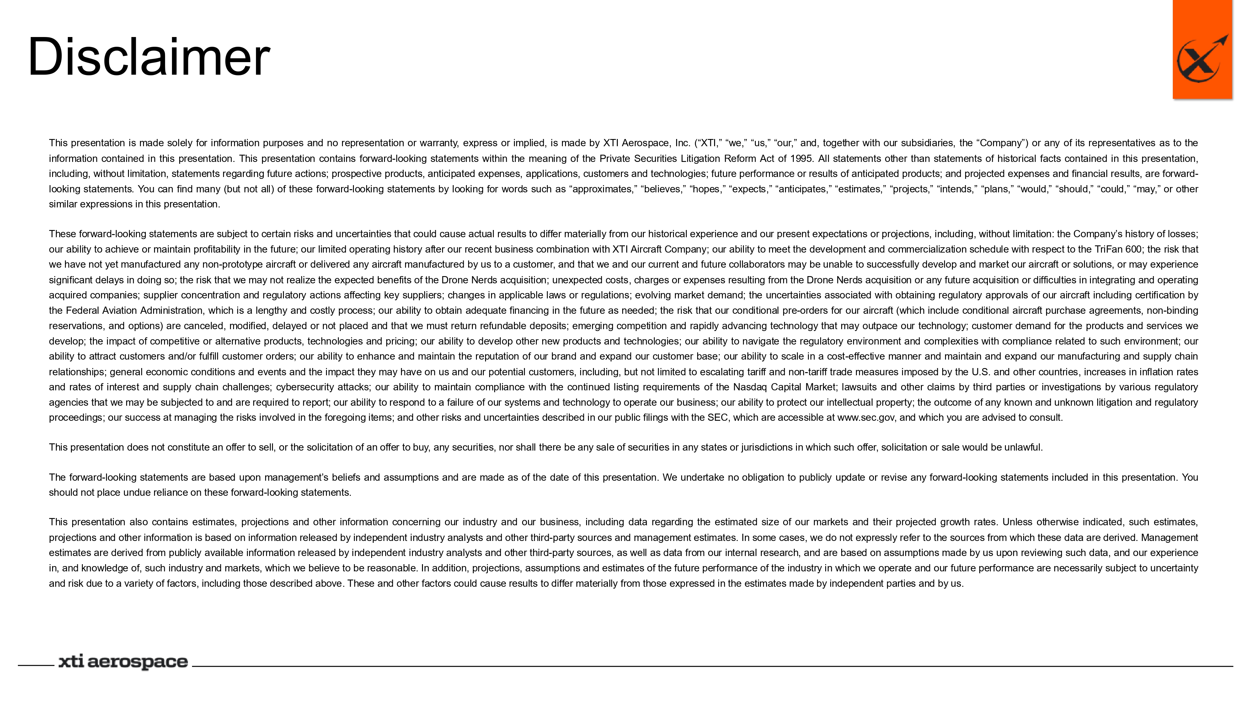 Disclaimer This presentation is made solely for information purposes and no representation or warranty, express or implied, is made by XTI Aerospace, Inc . (“XTI,” “we,” “us,” “our,” and, together with our subsidiaries, the “Company”) or any of its representatives as to the information contained in this presentation . This presentation contains forward - looking statements within the meaning of the Private Securities Litigation Reform Act of 1995 . All statements other than statements of historical facts contained in this presentation, including, without limitation, statements regarding future actions ; prospective products, anticipated expenses, applications, customers and technologies ; future performance or results of anticipated products ; and projected expenses and financial results, are forward - looking statements . You can find many (but not all) of these forward - looking statements by looking for words such as “approximates,” “believes,” “hopes,” “expects,” “anticipates,” “estimates,” “projects,” “intends,” “plans,” “would,” “should,” “could,” “may,” or other similar expressions in this presentation . These forward - looking statements are subject to certain risks and uncertainties that could cause actual results to differ materially from our historical experience and our present expectations or projections, including, without limitation : the Company’s history of losses ; our ability to achieve or maintain profitability in the future ; our limited operating history after our recent business combination with XTI Aircraft Company ; our ability to meet the development and commercialization schedule with respect to the TriFan 600 ; the risk that we have not yet manufactured any non - prototype aircraft or delivered any aircraft manufactured by us to a customer, and that we and our current and future collaborators may be unable to successfully develop and market our aircraft or solutions, or may experience significant delays in doing so ; the risk that we may not realize the expected benefits of the Drone Nerds acquisition ; unexpected costs, charges or expenses resulting from the Drone Nerds acquisition or any future acquisition or difficulties in integrating and operating acquired companies ; supplier concentration and regulatory actions affecting key suppliers ; changes in applicable laws or regulations ; evolving market demand ; the uncertainties associated with obtaining regulatory approvals of our aircraft including certification by the Federal Aviation Administration, which is a lengthy and costly process ; our ability to obtain adequate financing in the future as needed ; the risk that our conditional pre - orders for our aircraft (which include conditional aircraft purchase agreements, non - binding reservations, and options) are canceled, modified, delayed or not placed and that we must return refundable deposits ; emerging competition and rapidly advancing technology that may outpace our technology ; customer demand for the products and services we develop ; the impact of competitive or alternative products, technologies and pricing ; our ability to develop other new products and technologies ; our ability to navigate the regulatory environment and complexities with compliance related to such environment ; our ability to attract customers and/or fulfill customer orders ; our ability to enhance and maintain the reputation of our brand and expand our customer base ; our ability to scale in a cost - effective manner and maintain and expand our manufacturing and supply chain relationships ; general economic conditions and events and the impact they may have on us and our potential customers, including, but not limited to escalating tariff and non - tariff trade measures imposed by the U . S . and other countries, increases in inflation rates and rates of interest and supply chain challenges ; cybersecurity attacks ; our ability to maintain compliance with the continued listing requirements of the Nasdaq Capital Market ; lawsuits and other claims by third parties or investigations by various regulatory agencies that we may be subjected to and are required to report ; our ability to respond to a failure of our systems and technology to operate our business ; our ability to protect our intellectual property ; the outcome of any known and unknown litigation and regulatory proceedings ; our success at managing the risks involved in the foregoing items ; and other risks and uncertainties described in our public filings with the SEC, which are accessible at www . sec . gov , and which you are advised to consult . This presentation does not constitute an offer to sell, or the solicitation of an offer to buy, any securities, nor shall there be any sale of securities in any states or jurisdictions in which such offer, solicitation or sale would be unlawful . The forward - looking statements are based upon management’s beliefs and assumptions and are made as of the date of this presentation . We undertake no obligation to publicly update or revise any forward - looking statements included in this presentation . You should not place undue reliance on these forward - looking statements . This presentation also contains estimates, projections and other information concerning our industry and our business, including data regarding the estimated size of our markets and their projected growth rates . Unless otherwise indicated, such estimates, projections and other information is based on information released by independent industry analysts and other third - party sources and management estimates . In some cases, we do not expressly refer to the sources from which these data are derived . Management estimates are derived from publicly available information released by independent industry analysts and other third - party sources, as well as data from our internal research, and are based on assumptions made by us upo
