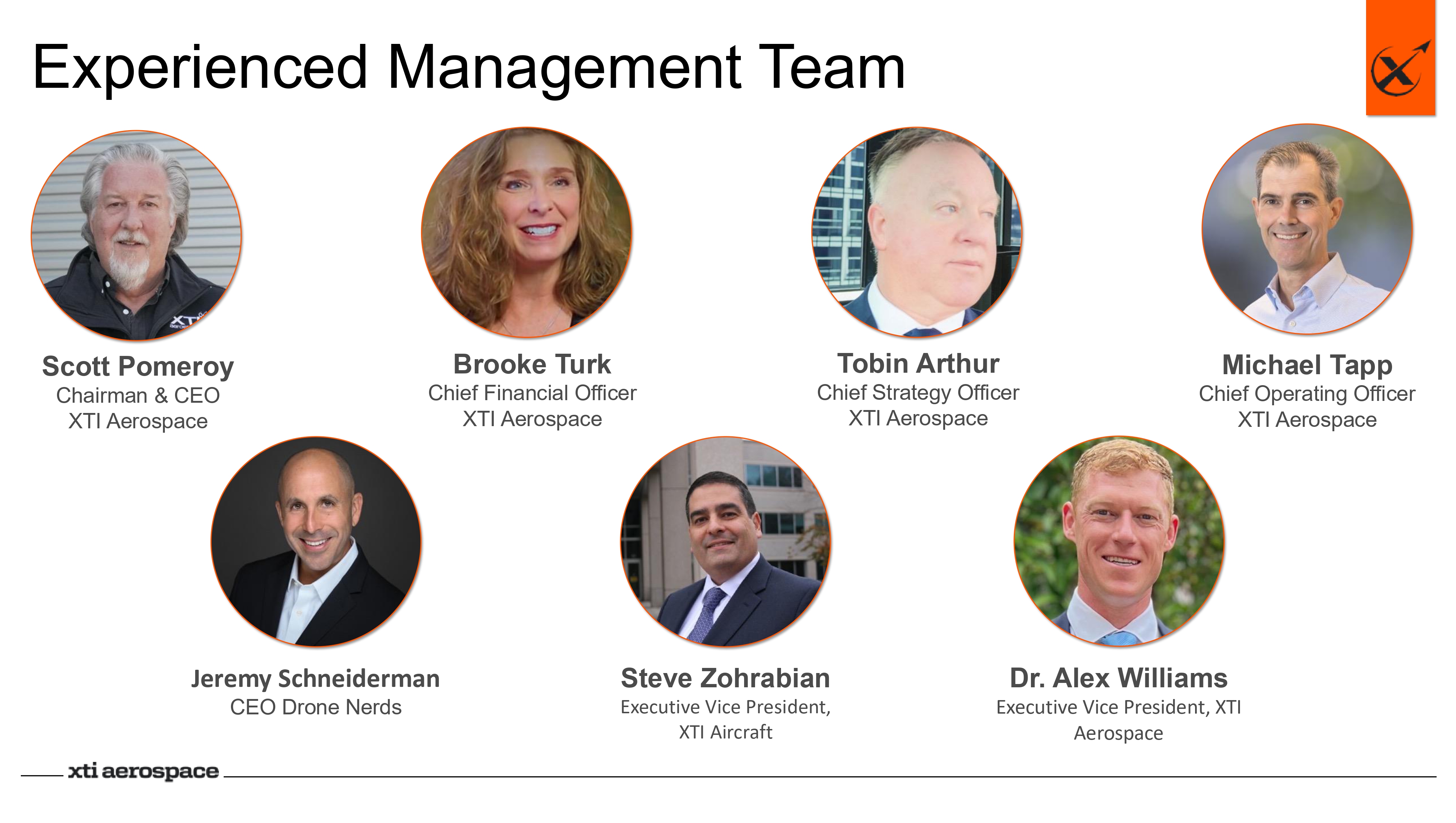 Michael Tapp Chief Operating Officer XTI Aerospace Scott Pomeroy Chairman & CEO XTI Aerospace Brooke Turk Chief Financial Officer XTI Aerospace Tobin Arthur Chief Strategy Officer XTI Aerospace Experienced Management Team Steve Zohrabian Executive Vice President, XTI Aircraft Dr. Alex Williams Executive Vice President, XTI Aerospace Jeremy Schneiderman CEO Drone Nerds