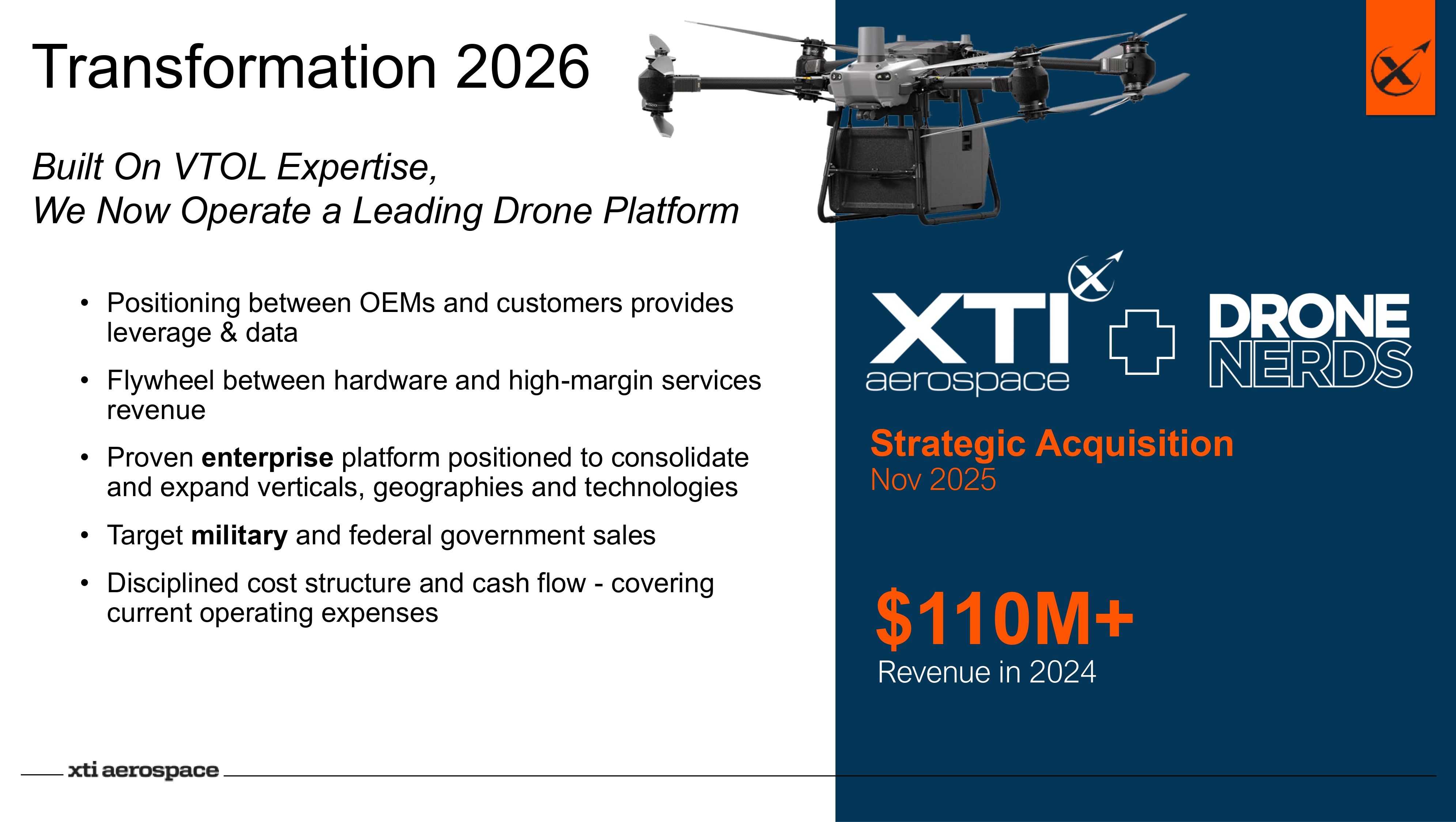 Transformation 2026 • Positioning between OEMs and customers provides leverage & data • Flywheel between hardware and high - margin services revenue • Proven enterprise platform positioned to consolidate and expand verticals, geographies and technologies • Target military and federal government sales • Disciplined cost structure and cash flow - covering current operating expenses Built On VTOL Expertise, We Now Operate a Leading Drone Platform Strategic Acquisition Nov 2025 $110M+ Revenue in 2024
