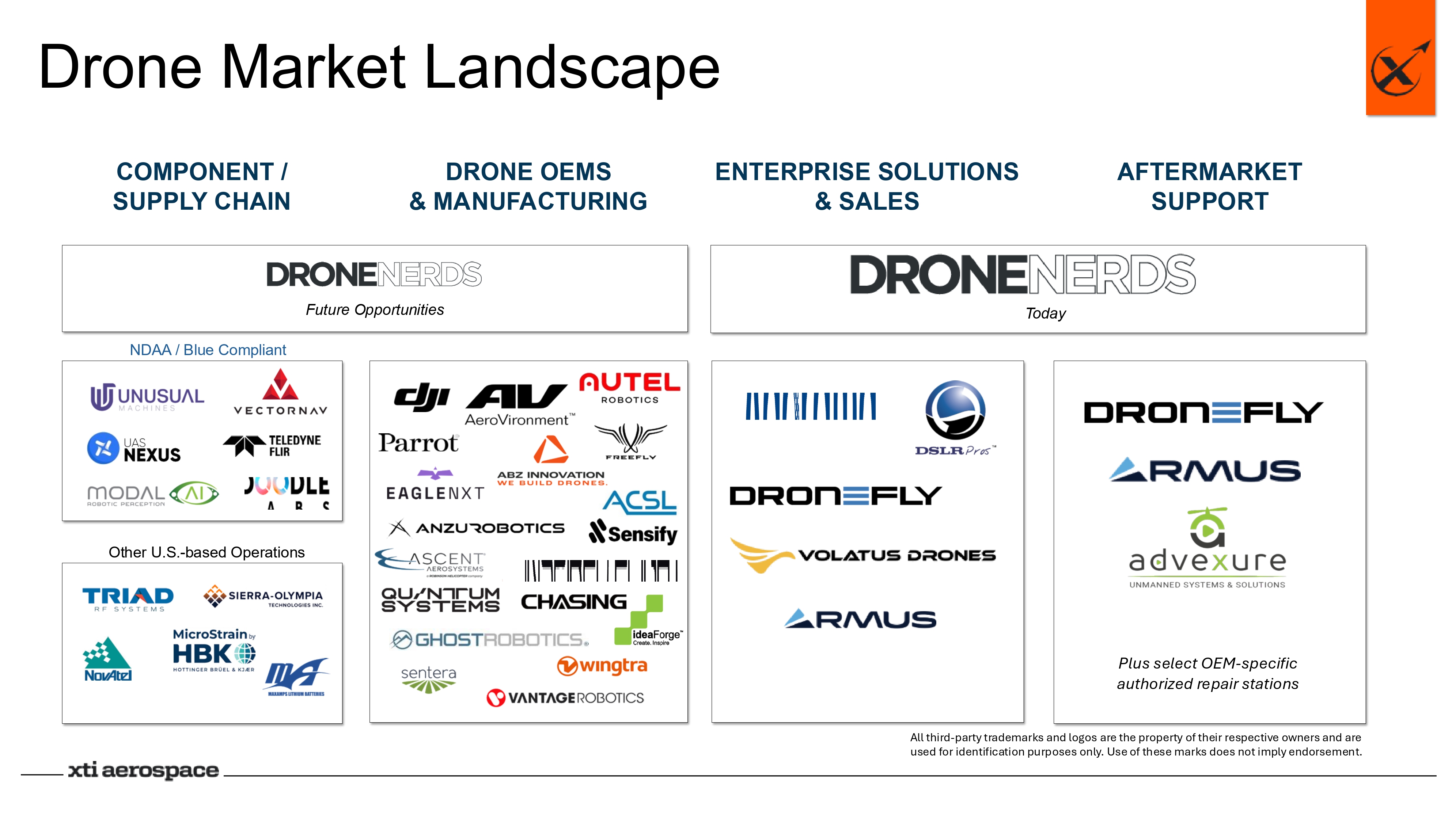 NDAA / Blue Compliant Other U.S. - based Operations Plus select OEM - specific authorized repair stations COMPONENT / SUPPLY CHAIN DRONE OEMS & MANUFACTURING ENTERPRISE SOLUTIONS & SALES AFTERMARKET SUPPORT Future Opportunities Today All third - party trademarks and logos are the property of their respective owners and are used for identification purposes only. Use of these marks does not imply endorsement. Drone Market Landscape