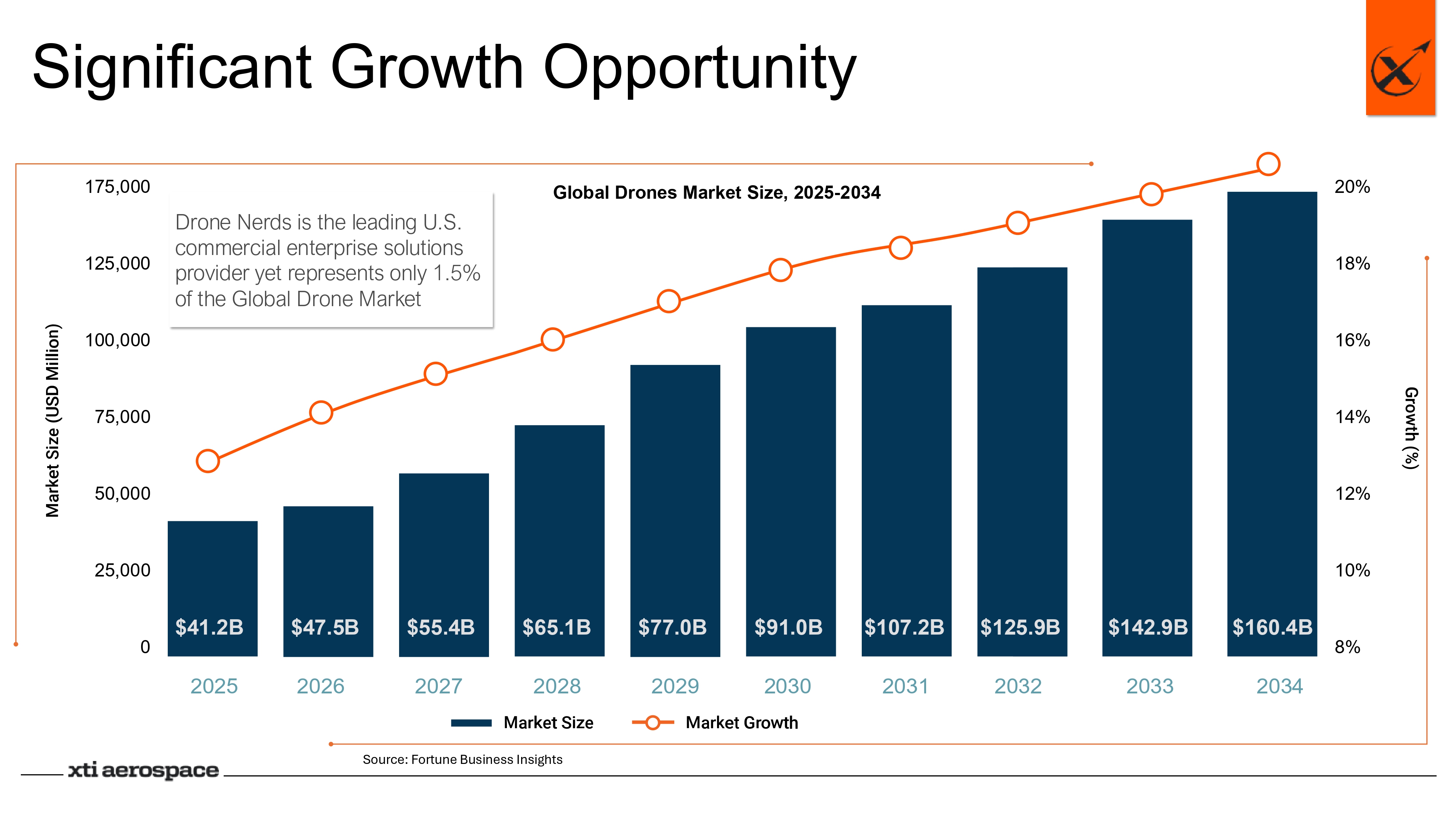 Significant Growth Opportunity Global Drones Market Size, 2025 - 2034 2025 2026 2027 2028 2029 2030 2031 2032 20 33 2034 Drone Nerds is the leading U.S. commercial enterprise solutions provider yet represents only 1.5% of the Global Drone Market Source: Fortune Business Insights $41.2B $47.5B $55.4B $65.1B $77.0B $91.0B $107.2B $125.9B $142.9B $16 0.4B 175,000 125,000 100,000 75,000 50,000 25,000 0 20% 18% 16% 14% 12% 10% 8%
