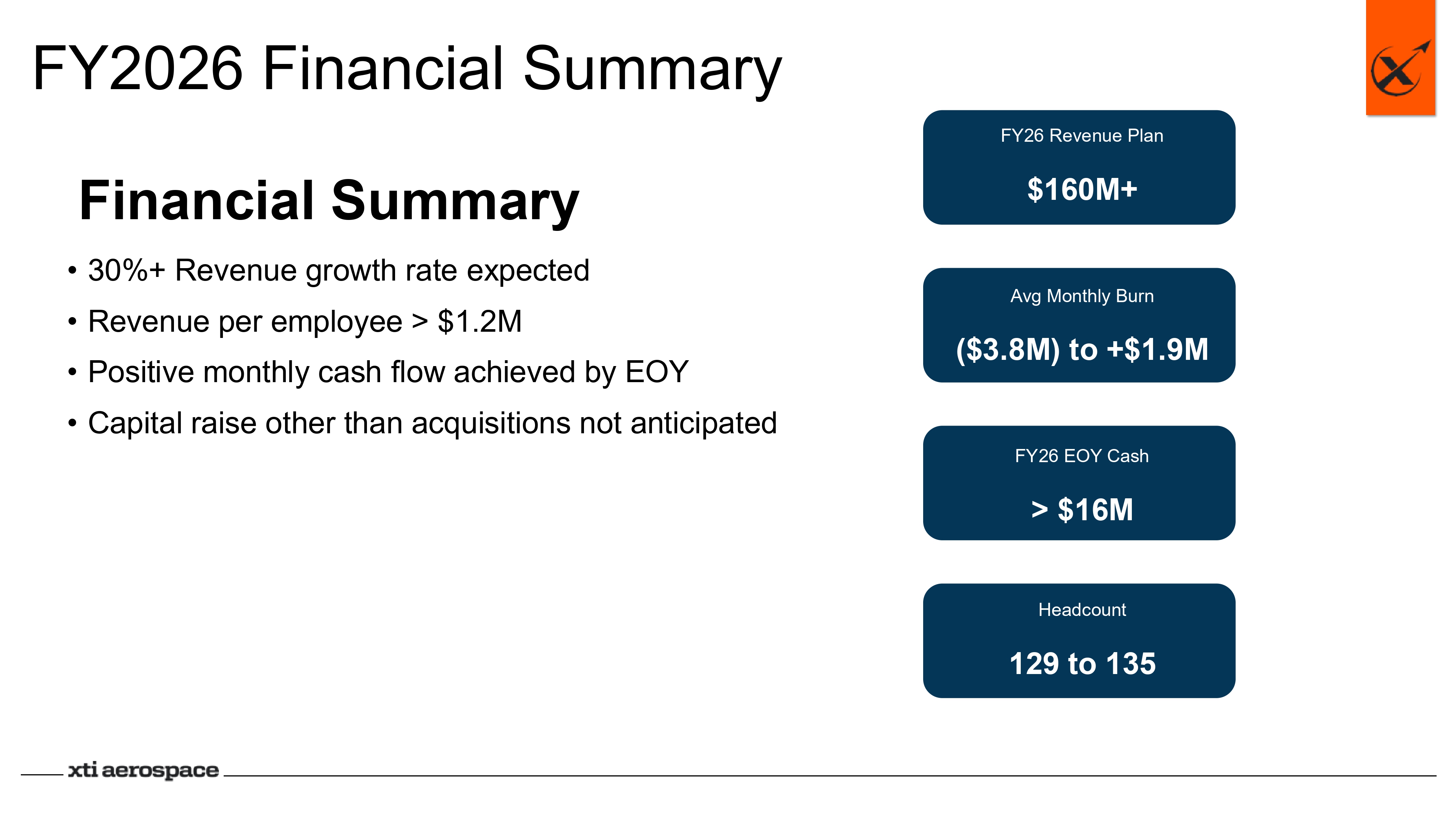 FY26 Revenue Plan $160M+ Financial Summary • 30%+ Revenue growth rate expected • Revenue per employee > $1.2M • Positive monthly cash flow achieved by EOY • Capital raise other than acquisitions not anticipated FY2026 Financial Summary Avg Monthly Burn ($3.8M) to +$1.9M FY26 EOY Cash > $16M Headcount 129 to 135