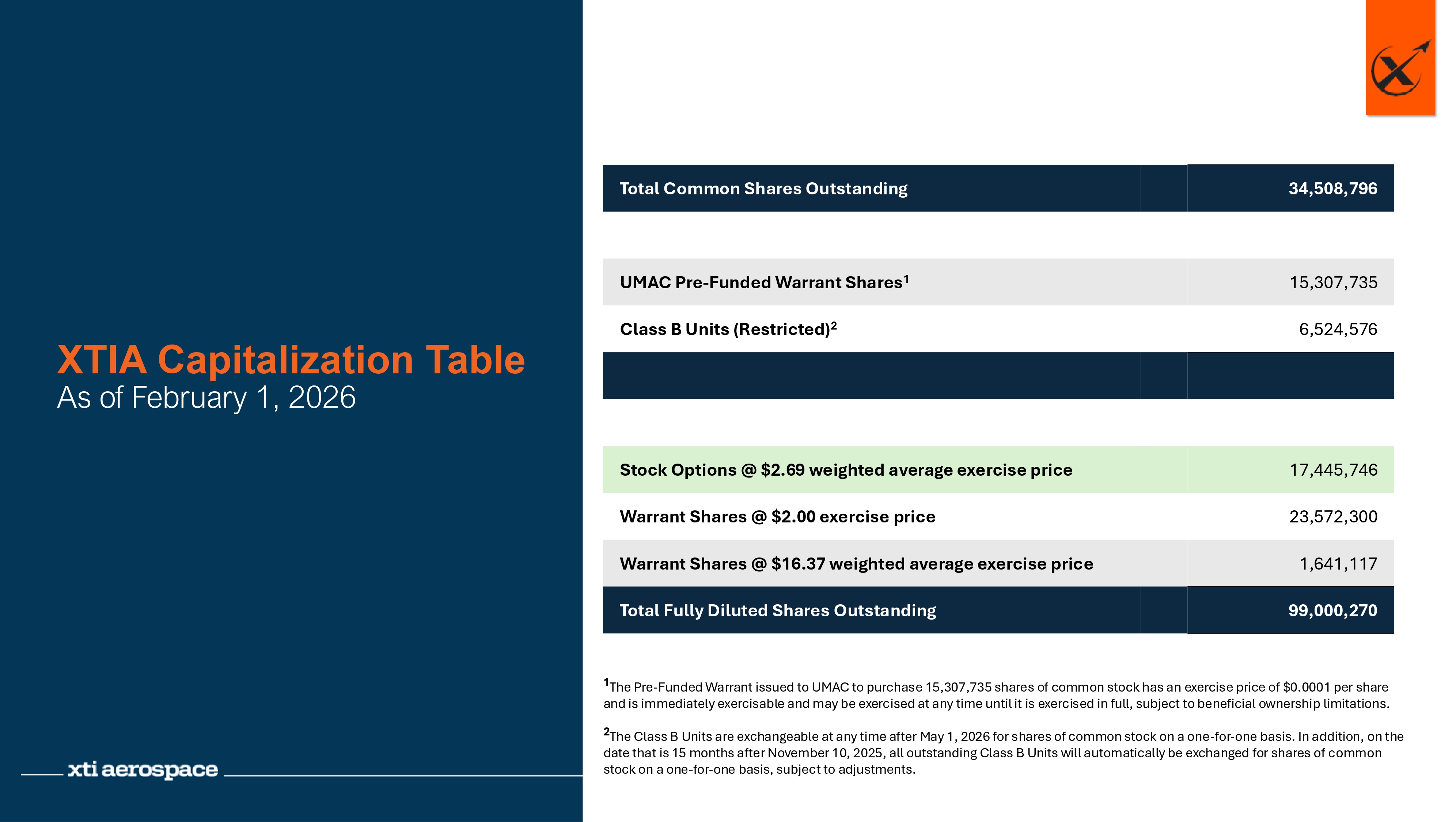 34,508,796 Total Common Shares Outstanding 15,307,735 UMAC Pre - Funded Warrant Shares 1 6,524,576 Class B Units (Restricted) 2 17,445,746 Stock Options @ $2.69 weighted average exercise price 23,572,300 Warrant Shares @ $2.00 exercise price 1,641,117 Warrant Shares @ $16.37 weighted average exercise price 99,000,270 Total Fully Diluted Shares Outstanding 1 The Pre - Funded Warrant issued to UMAC to purchase 15,307,735 shares of common stock has an exercise price of $0.0001 per share and is immediately exercisable and may be exercised at any time until it is exercised in full, subject to beneficial ownershi p l imitations. 2 The Class B Units are exchangeable at any time after May 1, 2026 for shares of common stock on a one - for - one basis. In addition, on the date that is 15 months after November 10, 2025, all outstanding Class B Units will automatically be exchanged for shares of c omm on stock on a one - for - one basis, subject to adjustments. XTIA Capitalization Table As of February 1, 2026