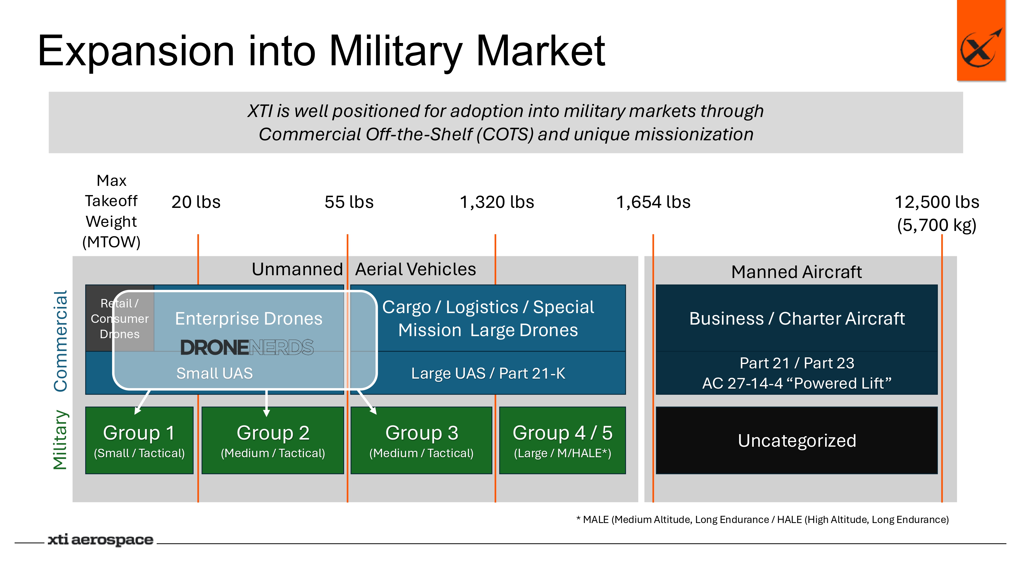Expansion into Military Market * MALE (Medium Altitude, Long Endurance / HALE (High Altitude, Long Endurance) XTI is well positioned for adoption into military markets through Commercial Off - the - Shelf (COTS) and unique missionization * MALE (Medium Altitude, Long Endurance / HALE (High Altitude, Long Endurance) 55 lbs 20 lbs 1,320 lbs 12,500 lbs (5,700 kg) 1,654 lbs Max Takeoff Weight (MTOW) Retail / Consumer Drones Enterprise Drones Cargo / Logistics / Special Mission Large Drones Business / Charter Aircraft Part 21 / Part 23 AC 27 - 14 - 4 “Powered Lift” Small UAS Group 1 (Small / Tactical) Group 2 (Medium / Tactical) Large UAS / Part 21 - K Group 3 (Medium / Tactical) Group 4 / 5 (Large / M/HALE*) Uncategorized Military Commercial Manned Aircraft Unmanned Aerial Vehicles